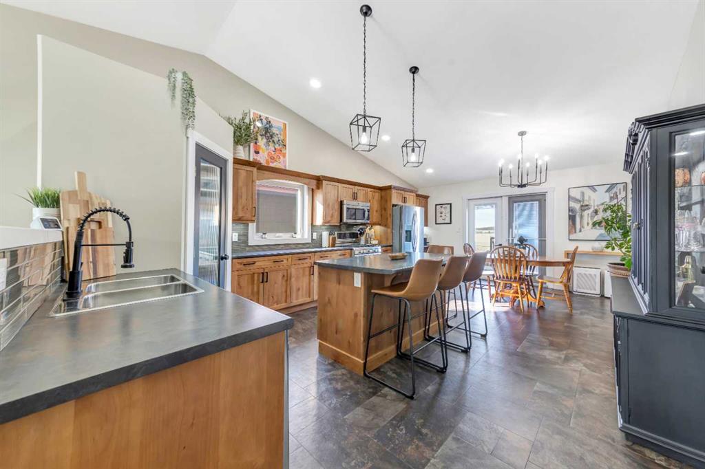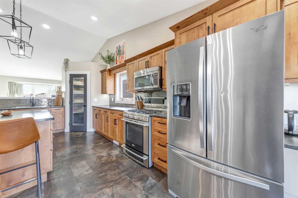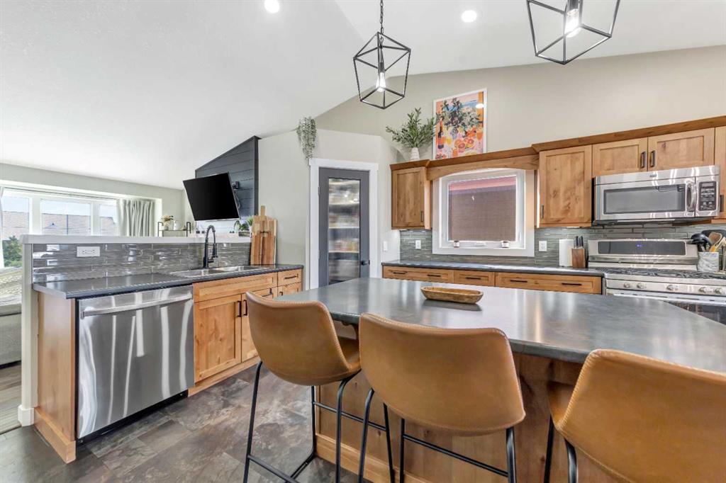 This well-maintained 1,380 sq.ft. bi-level offers space, functionality, and modern updates throughout. The main floor features vaulted ceilings and an open layout, creating a bright and inviting living space. The kitchen is designed for everyday living, with alder cabinetry, a corner pantry, stainless steel appliances, a gas stove, an electrified island, and a dining area that leads directly to the deck with a BBQ gas line.