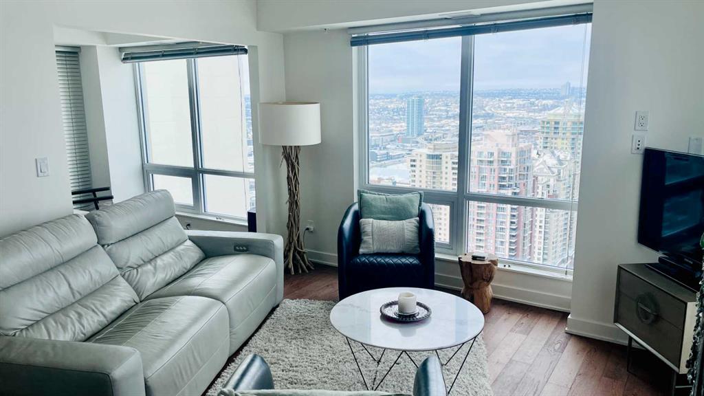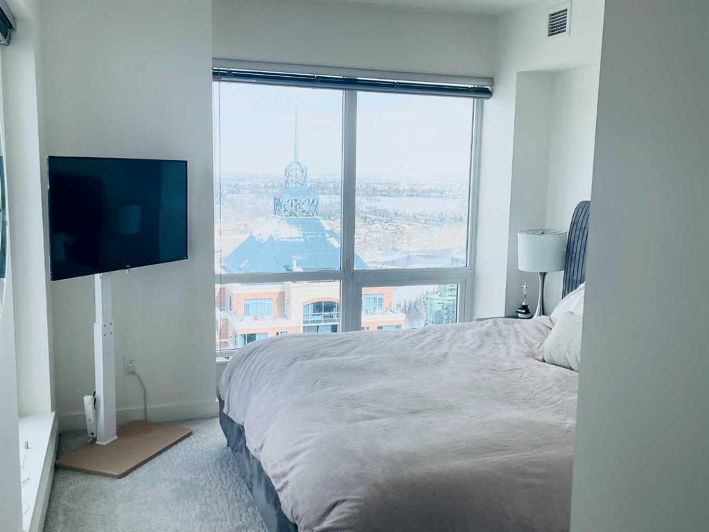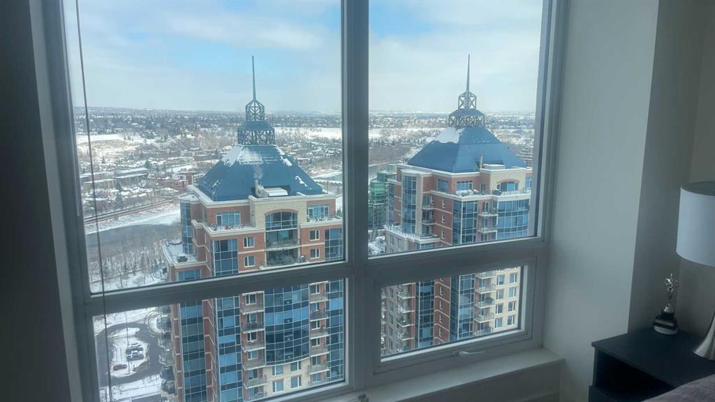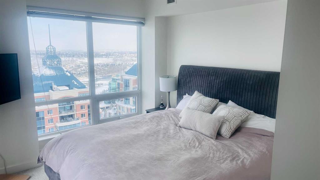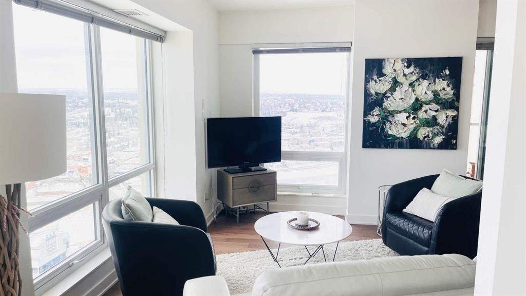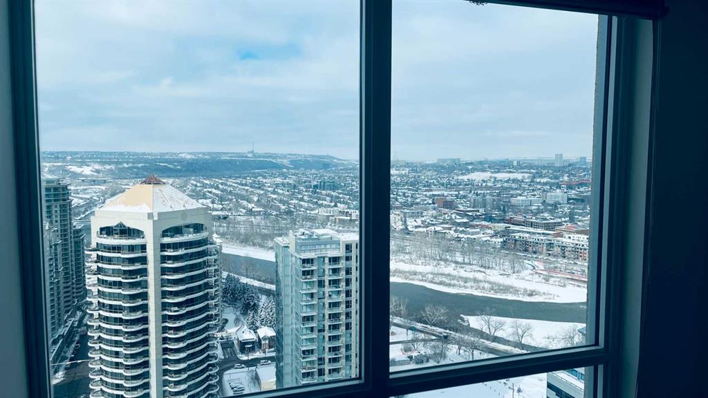 Experience luxury living high above Calgary in this premier NW corner suite on the 32nd floor, offering 1,017 sq.ft. of beautifully designed space with 2 bedrooms, 2 bathrooms + den. High ceilings and oversized windows bring the outside in, filling the home with natural light and framing spectacular 180° unobstructed views of the Bow River, Rocky Mountains, Kensington, downtown, and even the airport. This rare floorplan is one of only three units of its kind in the building, making it an exceptional opportunity.