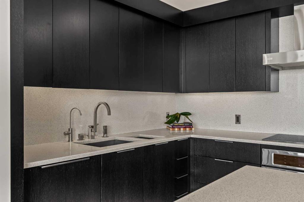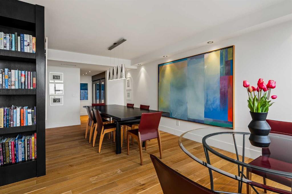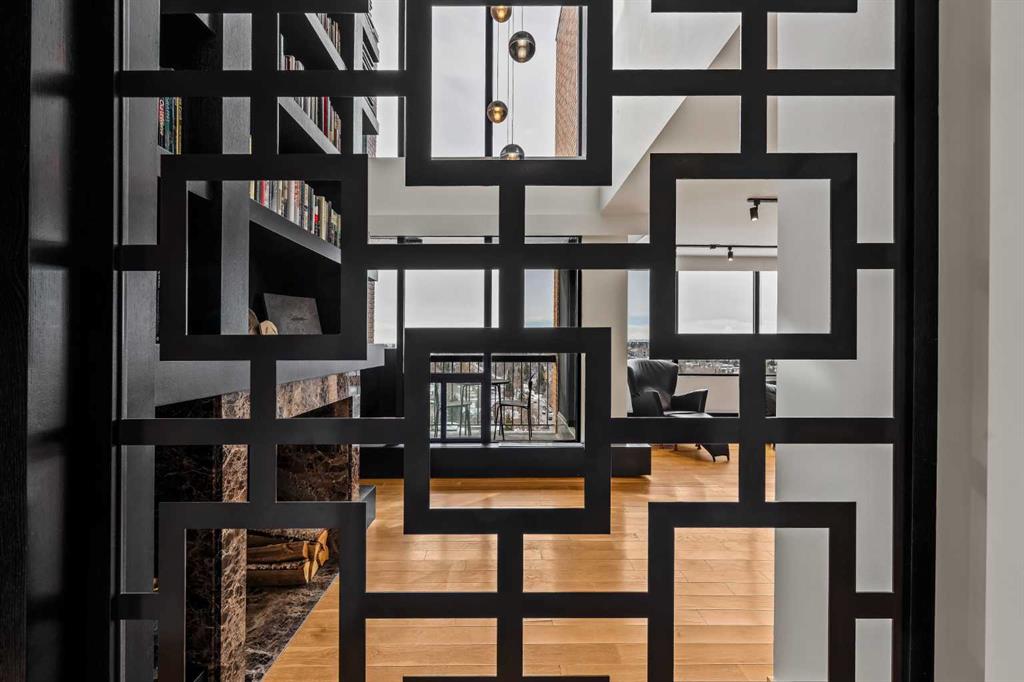 Architecturally renovated, this remarkable 2 storey penthouse delivers over 2,300 sq ft of refined living space with sweeping river valley and mountain views in the heart of Mission. Positioned within Roxboro House, one of Calgary’s most established concrete buildings, the home places river pathways, restaurants, cafés and downtown access within an easy walk while maintaining a quiet elevated setting above the city. Dramatic double height ceilings define the main living space where floor to ceiling windows frame expansive views and fill the interior with natural light throughout the day. Custom millwork and built-in library shelving introduce architectural character while a striking Bocci designer light installation creates a sculptural focal point above the living area. Marble fireplace surrounds add warmth and elegance while hardwood flooring extends throughout the home to create a cohesive and timeless finish. Entertaining flows easily between the living and dining areas where open sightlines toward the river valley form an impressive backdrop for gatherings. Quartz countertops and a full height quartz backsplash highlight the beautifully renovated kitchen where extensive custom cabinetry and a large central island support both daily routines and larger entertaining. Walk-in pantry storage keeps the space organized while built-in speaker wiring enhances the atmosphere for hosting. Adjacent bar cabinetry incorporates three wine fridges with capacity for approximately 750 bottles, creating a dedicated entertaining feature rarely found in condominium living. Upper level design introduces a flexible den retreat with its own fireplace and access to a second balcony, offering an ideal setting for a home office, lounge or private reading space overlooking the city skyline while an included Murphy bed allows the space to easily accommodate overnight guests when needed. Primary bedroom accommodations prioritize comfort and privacy through large windows, blackout blinds and extensive custom storage solutions. Heated floors in the lavish ensuite provide everyday comfort while modern fixtures enhance the spa-inspired atmosphere. Air conditioning supports year-round comfort and upper level laundry adds everyday convenience. Two private balconies extend the living space outdoors while showcasing panoramic mountain and river views. Tandem underground parking accommodates 2 vehicles and an assigned storage unit adds valuable extra space. Roxboro House residents enjoy secure entry with front desk service along with exceptional amenities including an indoor pool, hot tub, sauna, fitness room, woodworking shop, library and billiards lounge, party room and a beautifully landscaped sky terrace with BBQ areas and outdoor gathering spaces. Mission remains one of Calgary’s most vibrant inner-city neighbourhoods where river pathways, parks, restaurants and boutique shopping create an exceptional walkable lifestyle just minutes from downtown.