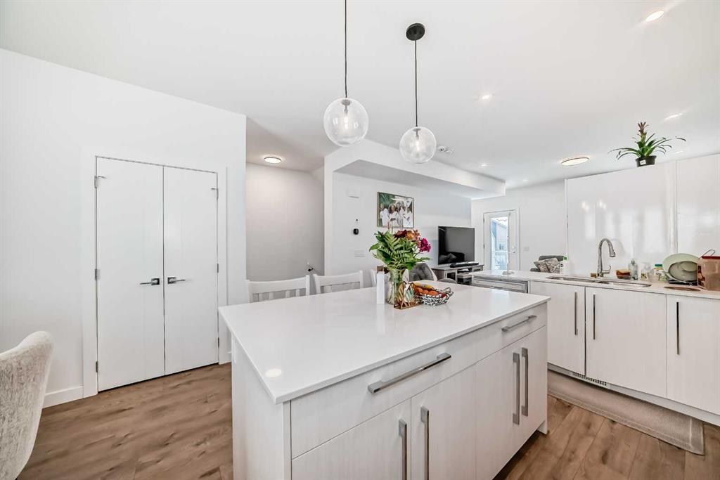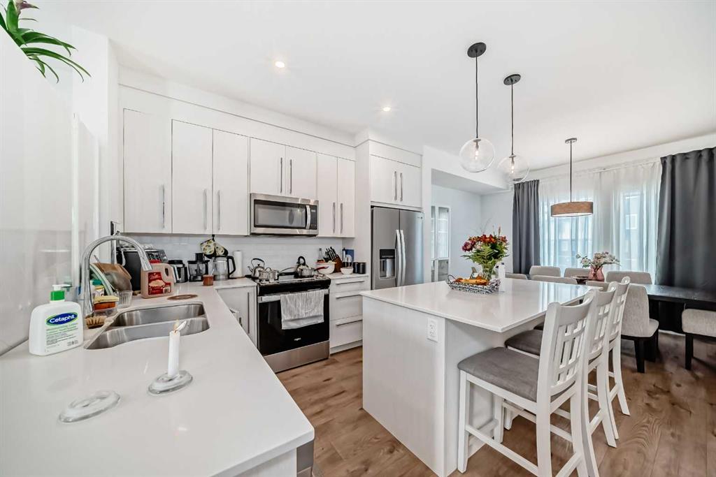 The next level up features a bright and open living space that flows from the living room into the dining area and kitchen. This functional kitchen features a large central working island with eating bar, an additional L-shaped island with another eating bar, stainless steel appliances, large pantry, quartz counter tops and attractive off-white cabinetry. From the living patio doors lead to a large balcony with gas line for a BBQ.