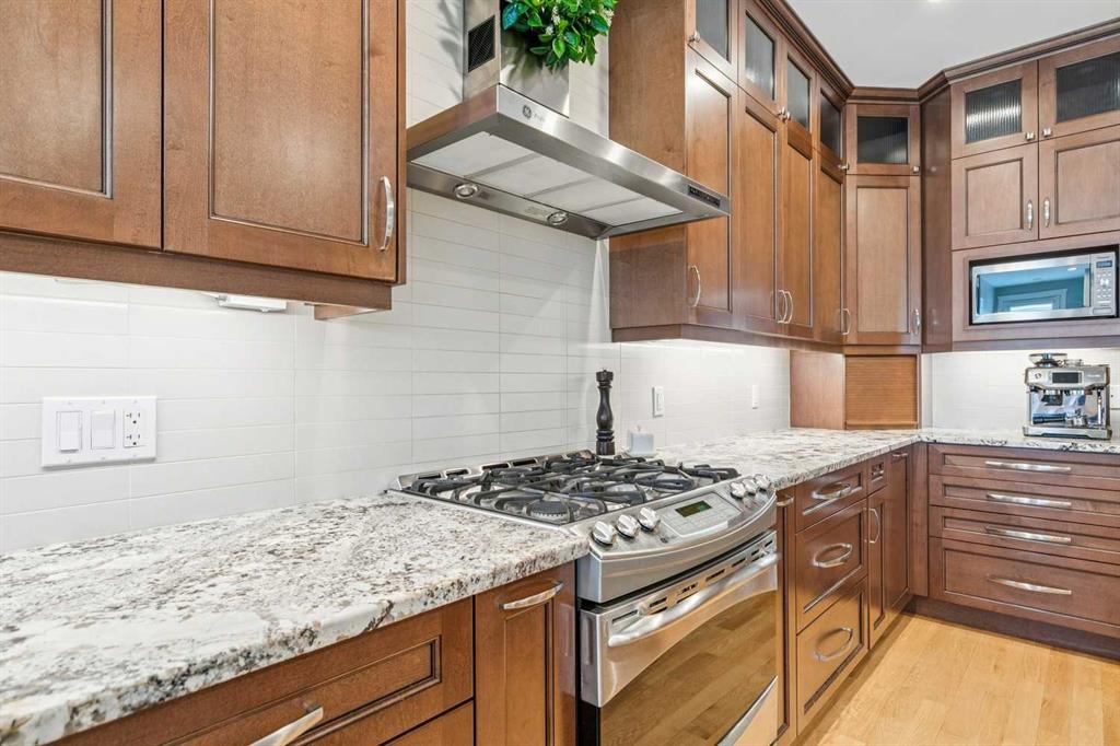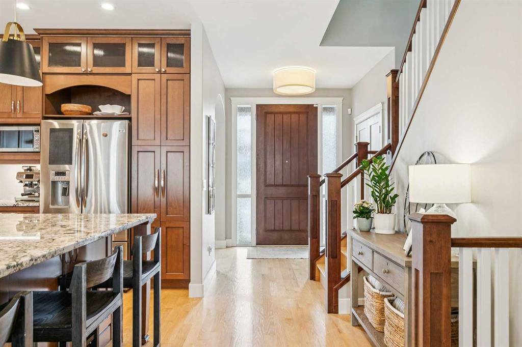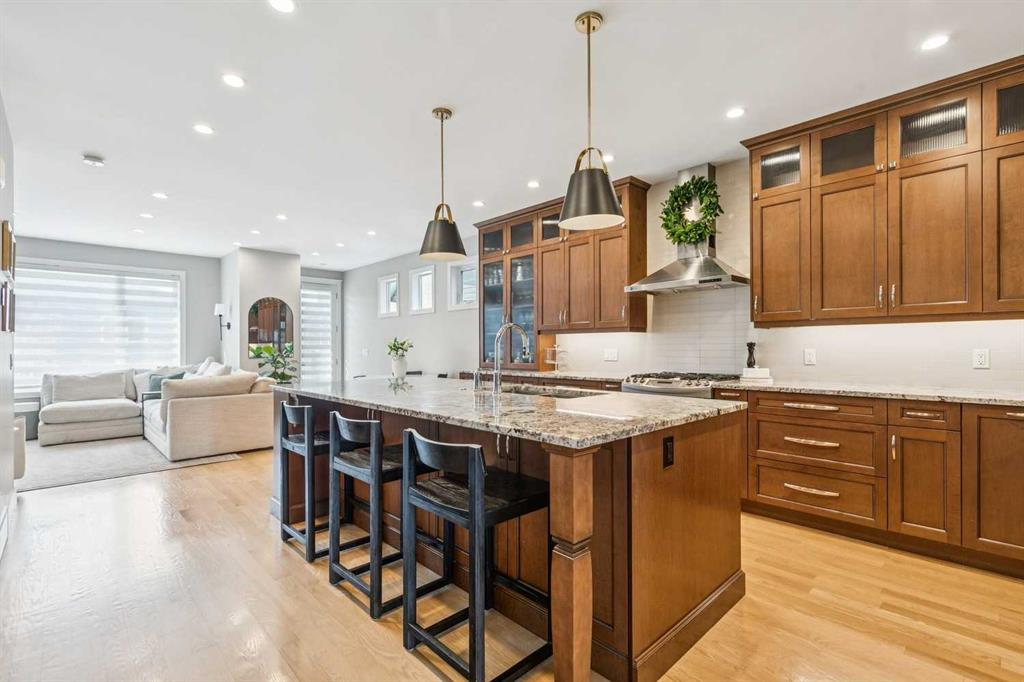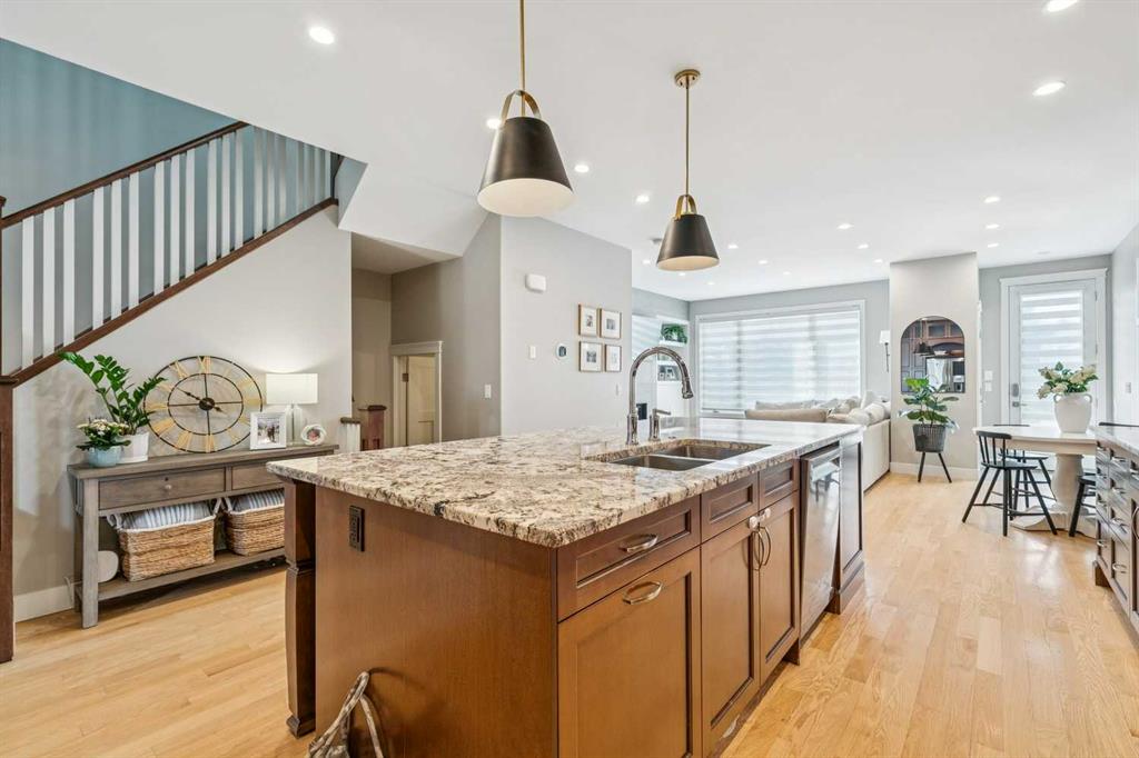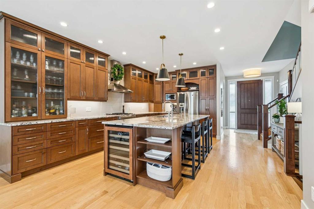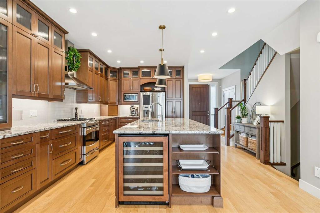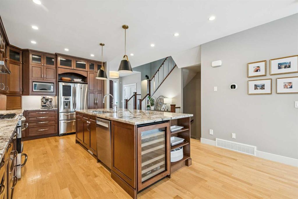 Welcome to this beautifully finished and fully developed two storey home offering a bright open layout, quality finishes, and comfortable living spaces designed for both everyday living and entertaining. 9-foot ceilings and gorgeous site finished oak hardwood floors carry you through the bright open plan main level, anchored by an expansive chef inspired kitchen with ample granite counter space including a breakfast counter for casual dining, along with stainless steel appliances that include a beverage fridge and gas range. The adjoining dining space keeps you connected to the main living area, while the living room features built ins, a cozy gas fireplace, and large windows overlooking the backyard. At the front of the home is a versatile flex room that works perfectly as a home office, playroom, or formal dining space. A convenient two-piece bathroom completes the main level. Upstairs you will find three spacious bedrooms including a large vaulted primary retreat with a walk-in closet and spa like five-piece ensuite featuring dual sinks with marble counters, a deep soaker tub, and a large custom tiled steam shower. The two additional bedrooms are both generously sized and there is also a convenient upper-level laundry room. The fully finished lower level offers a fourth bedroom, full bathroom, and a large family room with a wet bar and plenty of space for a home theatre, workout equipment, play area, and more. You will love the sunny west facing backyard with a patio that is perfect for relaxing or entertaining. Additional features include central air conditioning, recent upgrades such as new roof shingles and eavestroughs in 2025 and a new furnace and hot water tank in 2023, along with a drywalled double garage to complete the package. Conveniently located close to schools, parks, transit, and shopping. Call your favorite Realtor to arrange your private viewing!