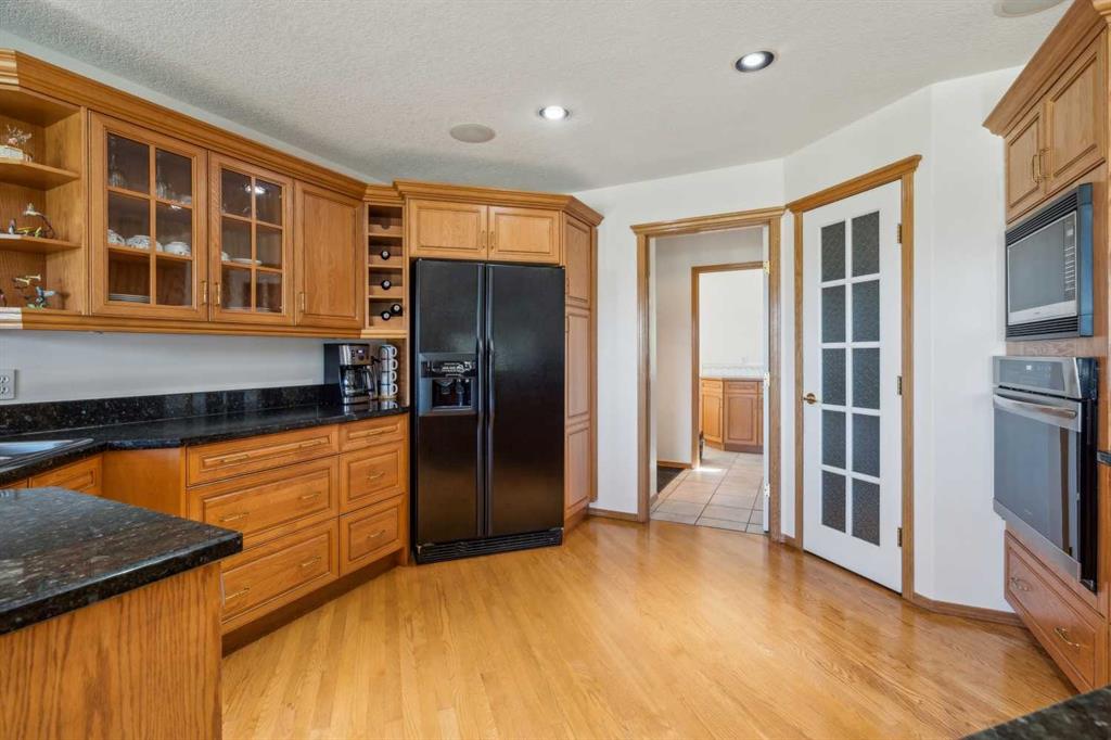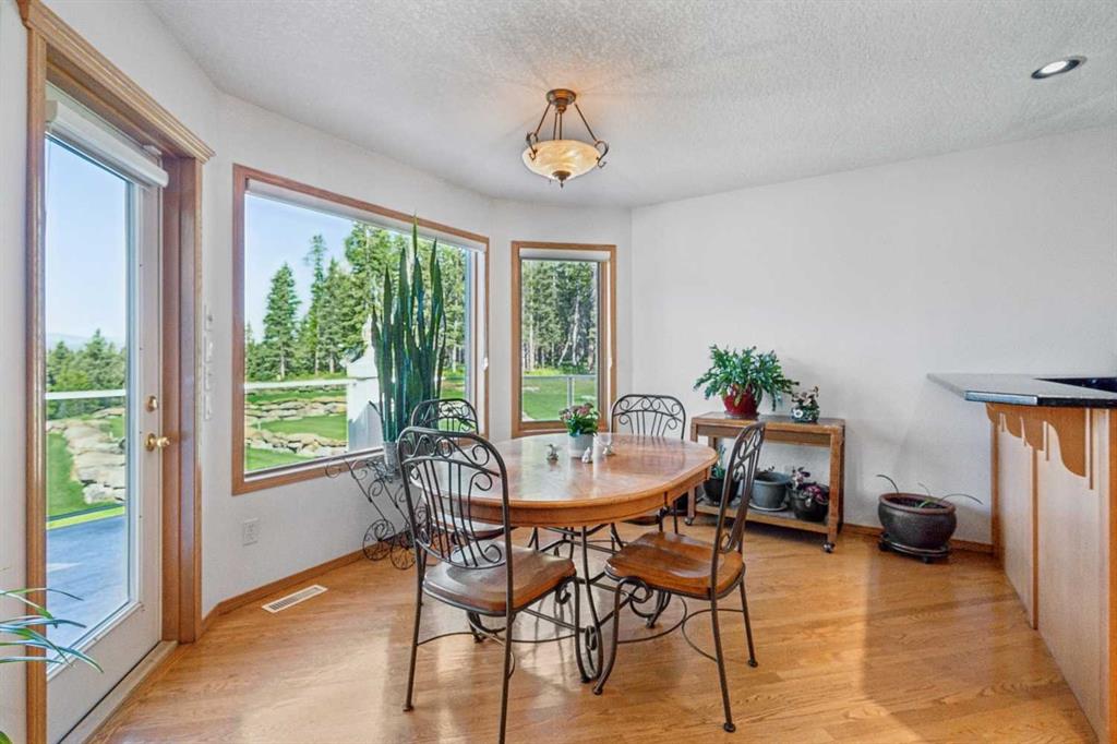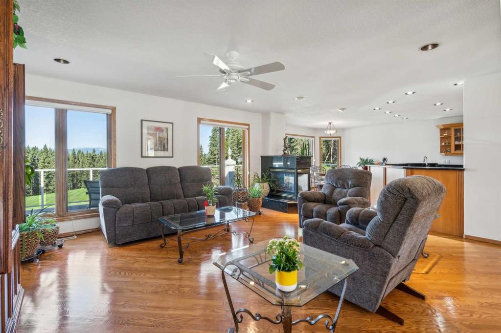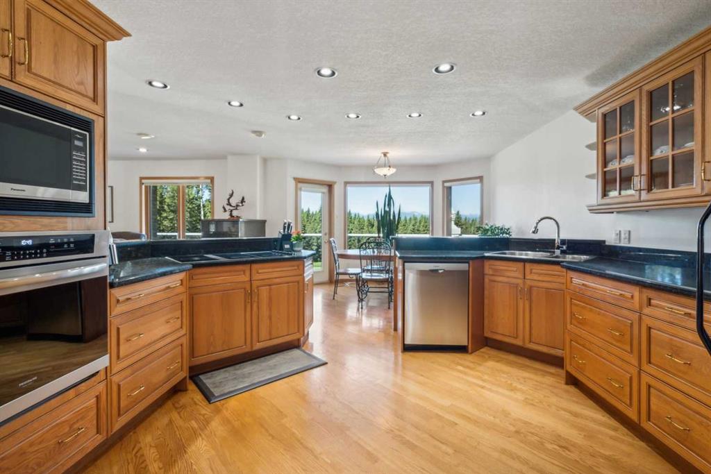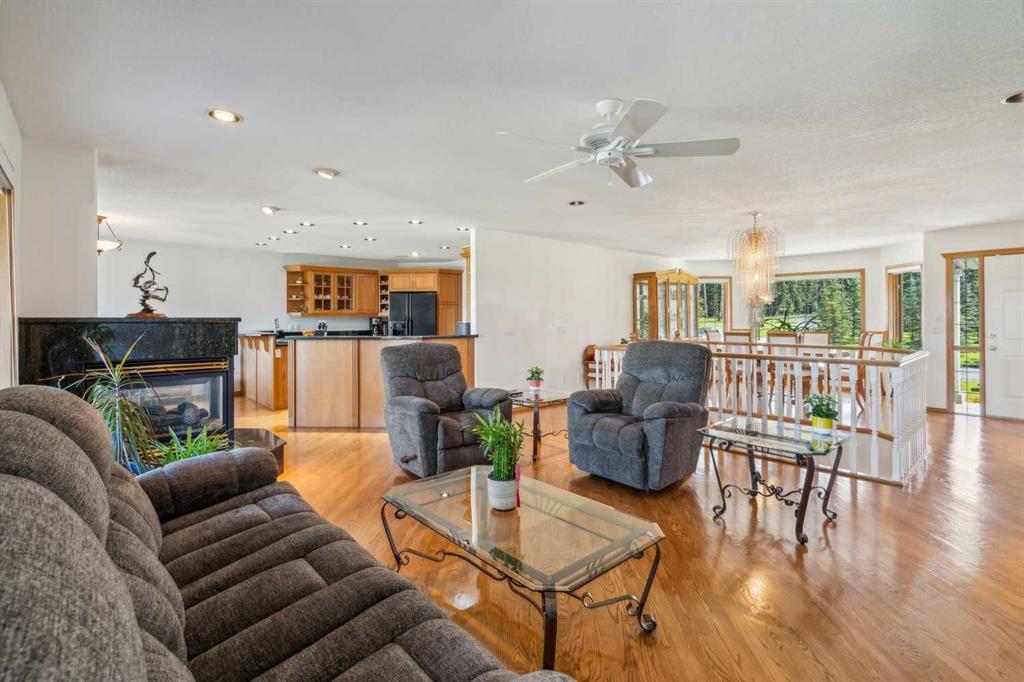 Less than thirty minutes from Calgary lies a jewel of a home, a secluded acreage with stunning views, and some very unique outbuildings. This 23 acre estate has a main floor and lower-level walkout; both with sweeping vistas of the impressively landscaped backyard and mountains beyond. Upon arrival through the private cul-de-sac, the first thing you notice are the impeccably maintained lawns and groomed driveway. The front entrance opens to a bright foyer that leads either to a formal dining area, or to a grand living room with site-finished oak floors and many windows showcasing the beauty beyond. It shares a three-way gas fireplace with the cosy dining nook and bay window, and the updated kitchen with quartz countertops and a large walk-through pantry. The pantry connects to the generous garage mudroom and laundry room. The large back deck runs along the length of the house and opens into the primary bedroom suite with walk-in closet, bay window, and 4-piece en-suite. This wing of the house has two more good size bedrooms and another full bathroom. The heated large three-car garage is an appealing feature with almost 1400 square feet of room, plenty of storage, windows, and a separate stair leading to the lower level. Downstairs you’ll find a large rec room with updated Berber carpet and a fieldstone floor-to-ceiling wood-burning fireplace, as well as an amazing bar with its own full size fridge and dishwasher- the perfect place to entertain. There is also a spacious office, and another bedroom and bath that would be perfect for guests. Leaving the main house, you’ll come to a truly special feature of the property, a large shop which is a mechanics dream. Not only does it have a ten thousand pound hoist and lift, but also radiant in-floor heat, and has its own bathroom, shower and laundry. Socks not completely knocked off? Attached is a very spacious area that used to be a fully functional butcher shop, complete with a large walk-in cooler. Although this space would be a hunter\'s delight, it also has many possibilities for studio space, other hobbies, or home based business, with its gleaming tile, industrial sinks, and extensive counters. There is also another 30 x 60 storage building for the toys; to store boats, cars, recreational vehicles or any other equipment. This acreage is one of a kind!