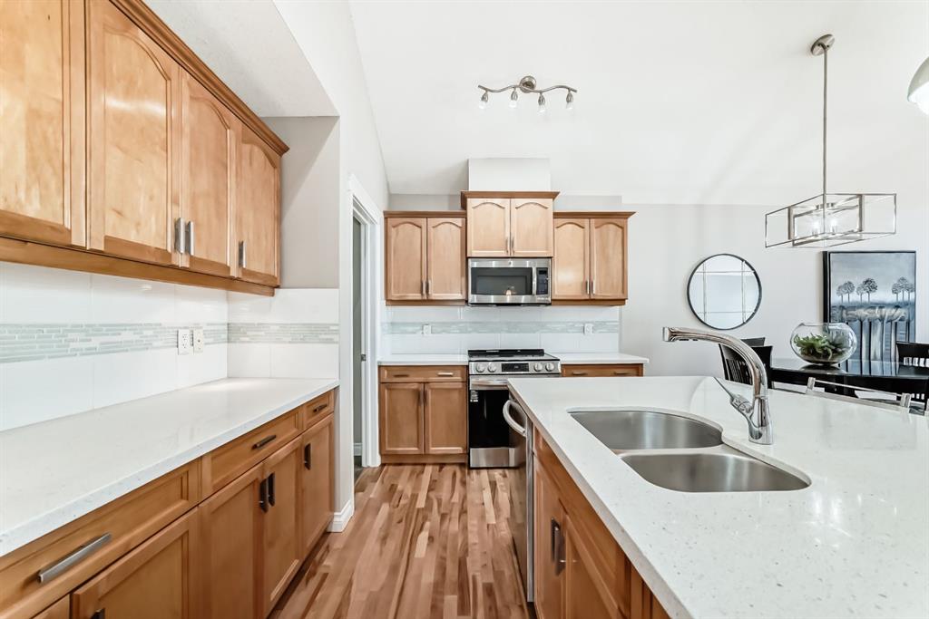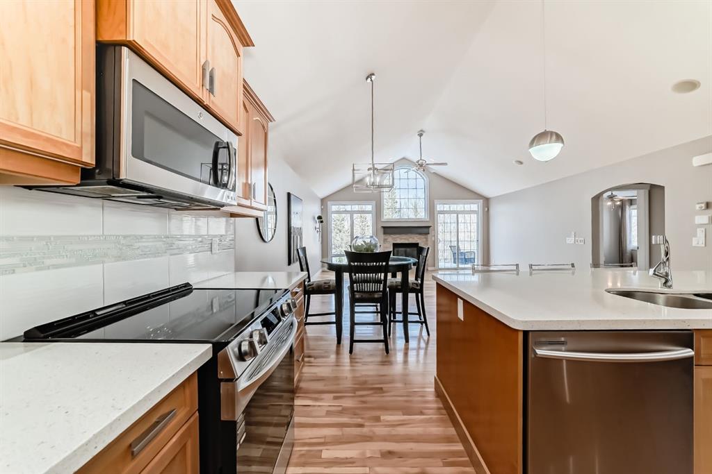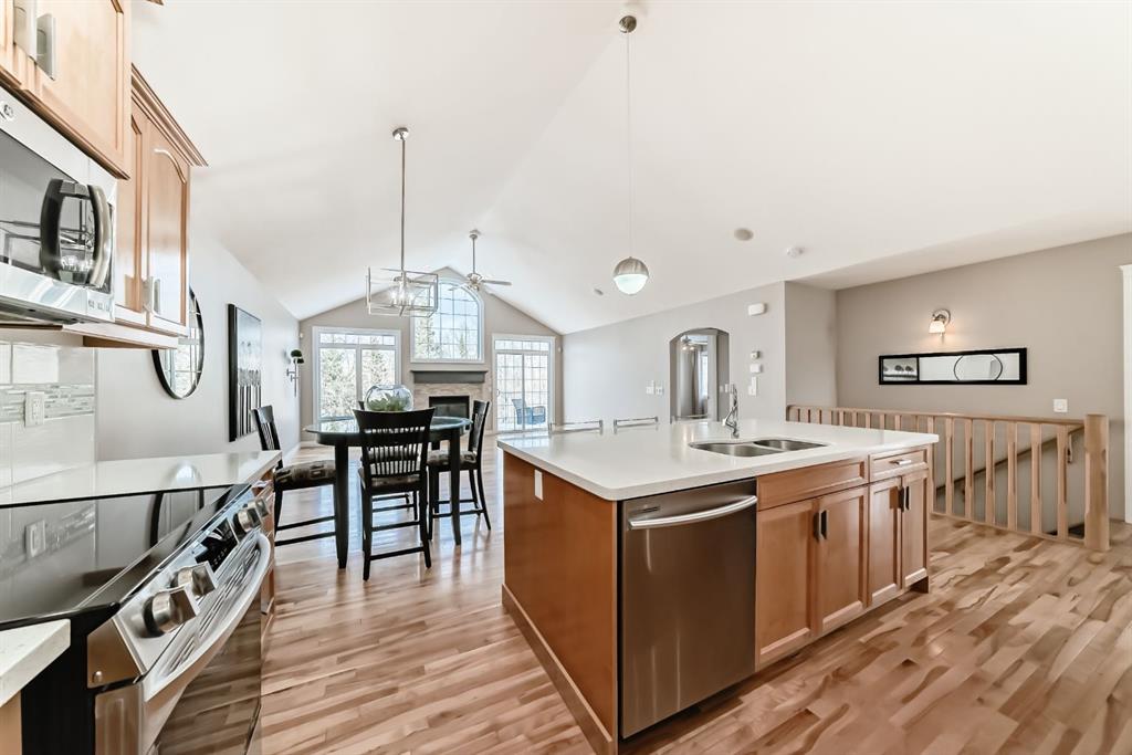 BEAUTIFUL ESTATE VILLA | FULLY DEVELOPED WALK-OUT BASEMENT | IN-FLOOR HEAT | UPGRADES THROUGHOUT | BACKS ONTO SHEEP RIVER VALLEY | Rarely does a home like this come available!!! Tucked away in a quiet & tranquil location, this home is fabulous…showcasing a dramatic vaulted ceiling in a spacious & open floor plan with large windows allowing for an abundance of natural light & breathtaking views of the woods of Sheep River Valley! The main level features a terrific layout that is not only stylish but also functional…the kitchen is beautiful with white quartz countertops, a huge island with undermount sink, stainless steel appliances including a brand new stove & a walk-through pantry. The kitchen overlooks the open dining area & huge living room with gas fireplace…perfect for entertaining! From the living room, the patio doors open to the deck that looks out onto the woods…your oasis to enjoy Mother Nature! The Master bedroom is generous in size, has custom window coverings & a renovated 5pc ensuite with dual sinks, jetted tub, separate shower & walk-in closet. Completing this main level is a sunny den (with closet), large tiled foyer, laundry & mudroom. The walkout basement, with in-floor heat throughout, is fully finished…there is a huge family/rec room with gas fireplace & fantastic wet bar…spacious enough to allow for a full games area and a separate family/sitting area. There are 2 additional bedrooms (both large is size), a 4pc bathroom & additional storage. From the family room you have direct access to the covered patio. EXTRA FEATURES: Newly repainted, in-ceiling speakers, high ceilings, central A/C, low condo fees, and more! This home is available for a quick possession! Don’t let this incredible opportunity pass you by!