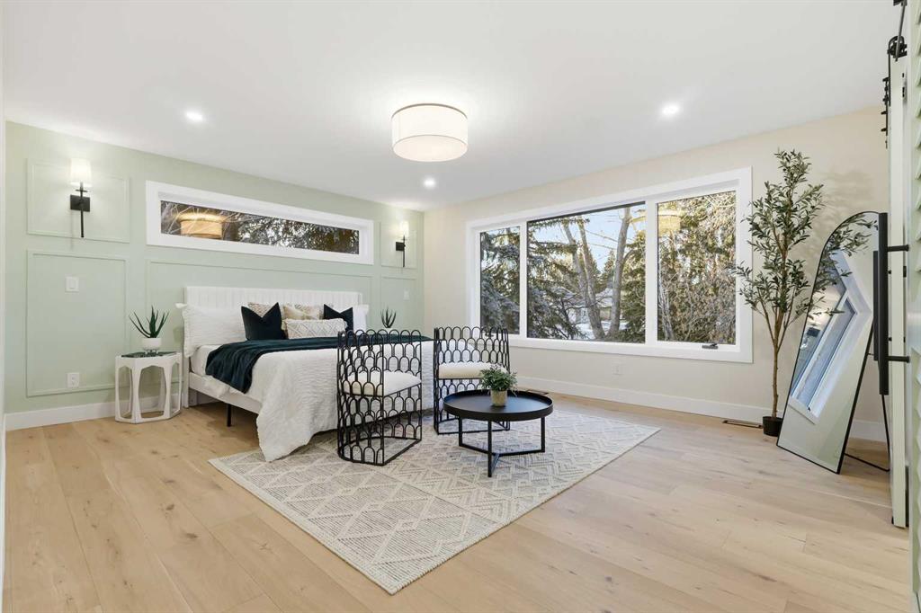 The primary retreat was designed to immerse you in that calm, with a massive picture window, warm wood accents and natural tones that invite you to exhale. A huge walk-in closet with custom built-in organizers completes the suite, including a makeup desk set beneath a window for natural light. The spa-like ensuite continues the experience with a generously scaled tiled shower with glass doors, a fluted freestanding tub that blends effortlessly into the fluted tile feature wall, and in-floor heating—finishes that feel cohesive and intentional from space to space.