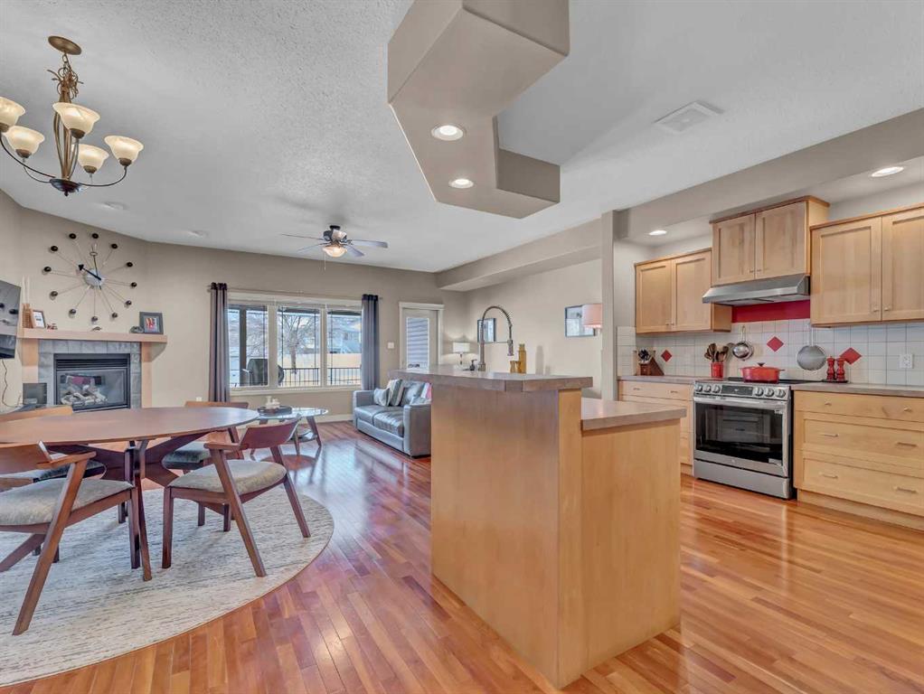 This home features a modern, spacious layout and numerous recent updates. The open-concept main floor boasts 9-foot ceilings and includes a welcoming living room with a cozy gas fireplace, a large kitchen, and a dining area—all overlooking the beautiful backyard and peaceful green space beyond. Whether you’re enjoying your morning coffee or winding down in the evening, the relaxing views create a calm and inviting atmosphere throughout the main living area.