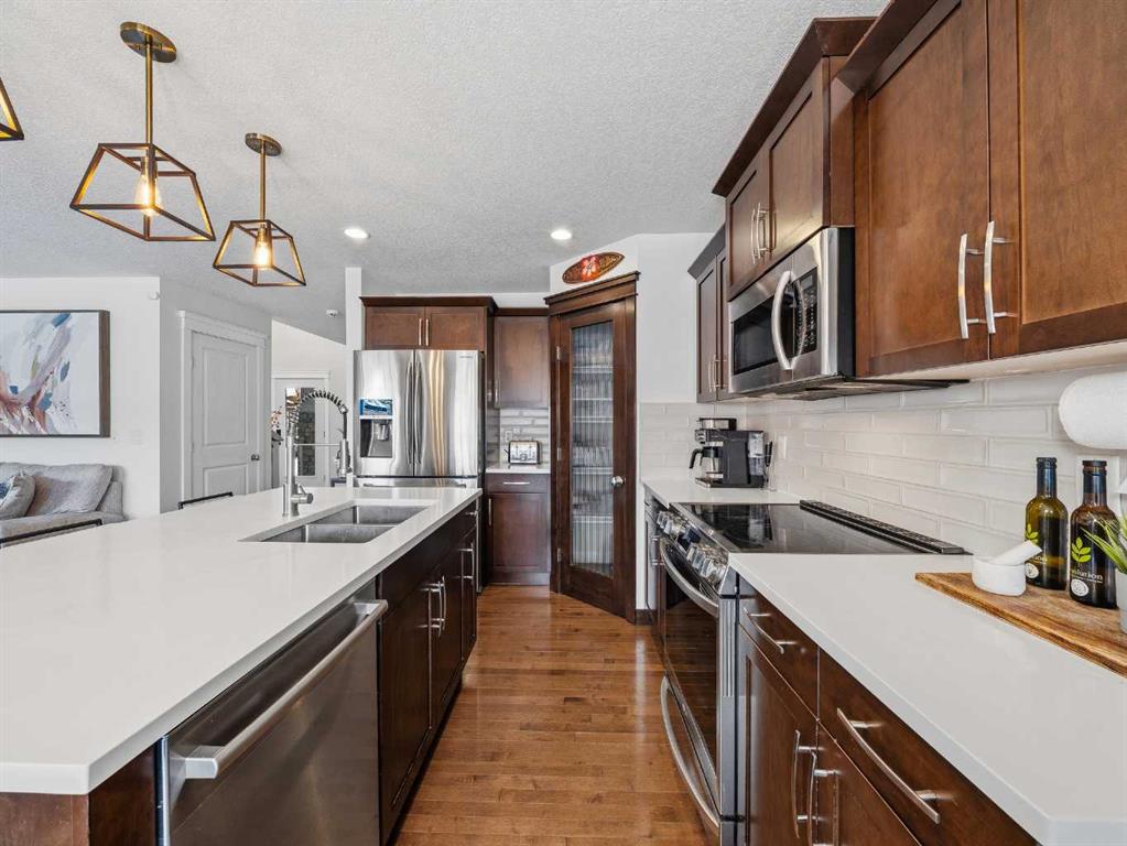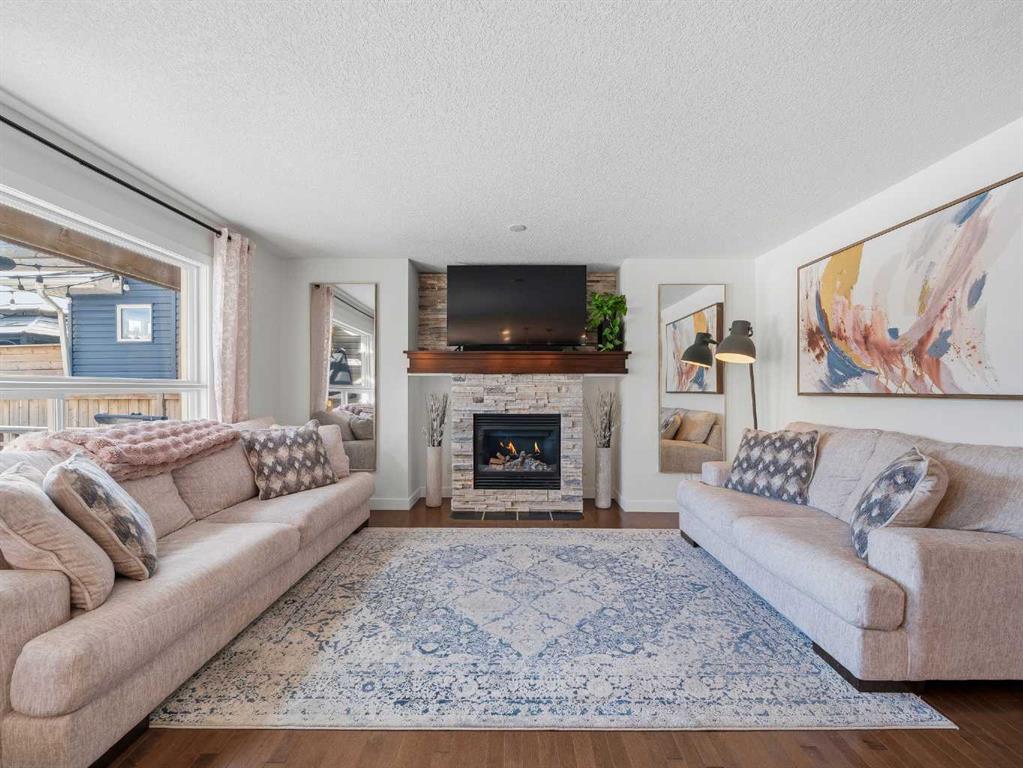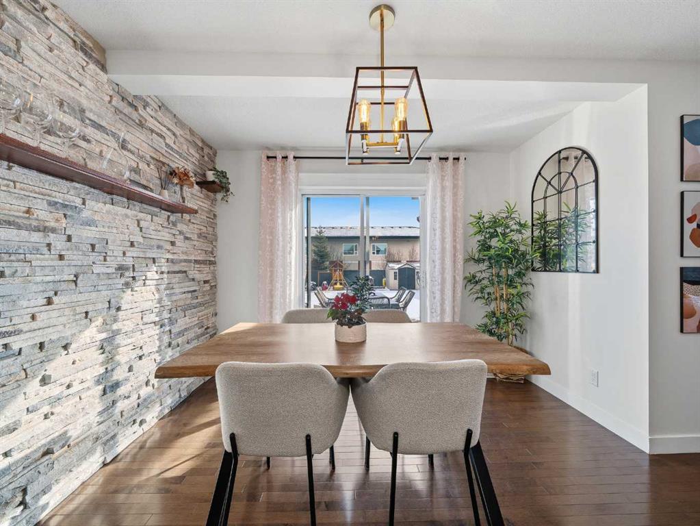 The main floor features a bright, open-concept design with hardwood floors throughout. The kitchen has been updated with quartz countertops, modern light fixtures above the island and dining area, and offers ample prep and storage space, including a full pantry. Stainless steel appliances are included, with the dishwasher replaced approximately two years ago. The kitchen flows seamlessly into the dining area and adjoining living room, making the main level ideal for family gatherings and entertaining. Stonework in the dining area matches the stone detail on the living room fireplace, adding a cohesive look to the space. An updated half bath and convenient main-floor laundry closet complete this level. Upstairs, the large primary bedroom features a barnwood feature wall, walk-in closet, and a refreshed ensuite with quartz countertops and a skylight that fills the space with natural light. The second floor also includes a spacious bonus room, two additional bedrooms, and a four-piece main bath. The fully developed basement adds a versatile extension of living space with a dry bar and wine fridge, a modern full bathroom, and an additional bedroom. A tiled electric fireplace and pre-wired surround sound make this level perfect for movie nights or relaxing with family. The insulated and drywalled double garage connects directly to the main level of the home. Outside, the large, level, rectangular lot (approximately 150 feet deep) offers plenty of room for play structures or gardening. The massive, two-tiered deck with pergola spans the full width of the home, creating an excellent outdoor living and entertaining area. Exterior updates completed in 2025 include new siding, roof, and eavestroughs. The furnace has been serviced regularly, with a new blower installed in September 2025. Located in Evanston, this home offers convenient access to parks, pathways, and two major retail hubs—Evanston Towne Centre and Creekside Shopping Centre on Symons Valley Road. Nearby public schools include Kenneth D. Taylor School (K–4) and Our Lady of Grace School (K–9). School designations are subject to change, and enrollment is not guaranteed; buyers should confirm details directly with the relevant school boards.