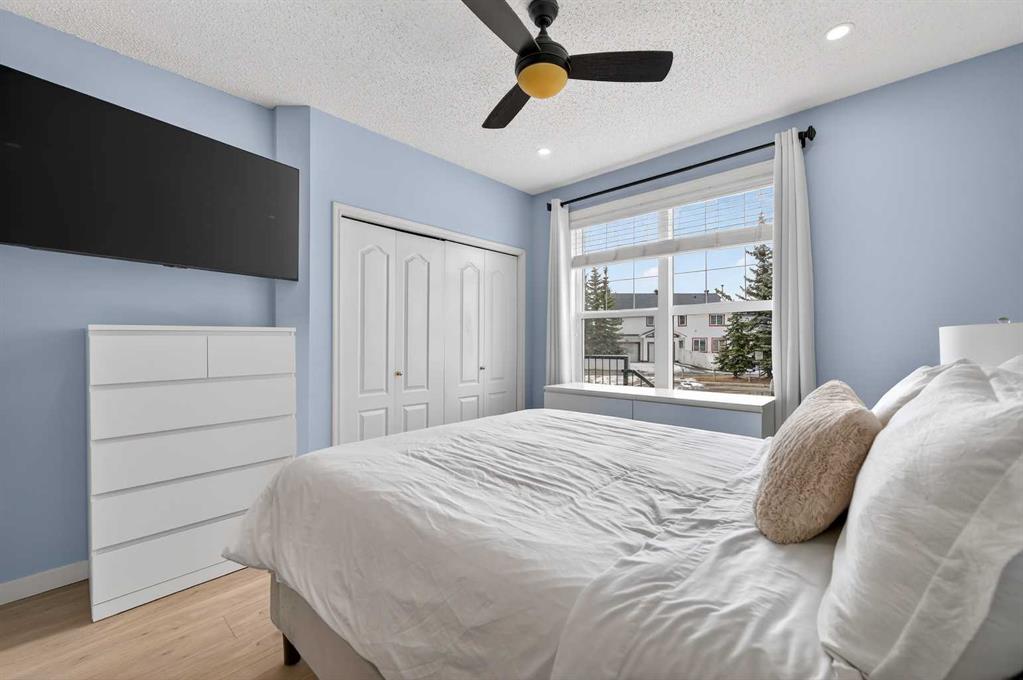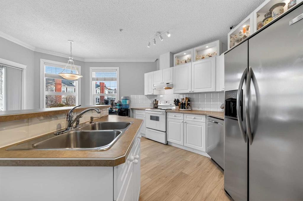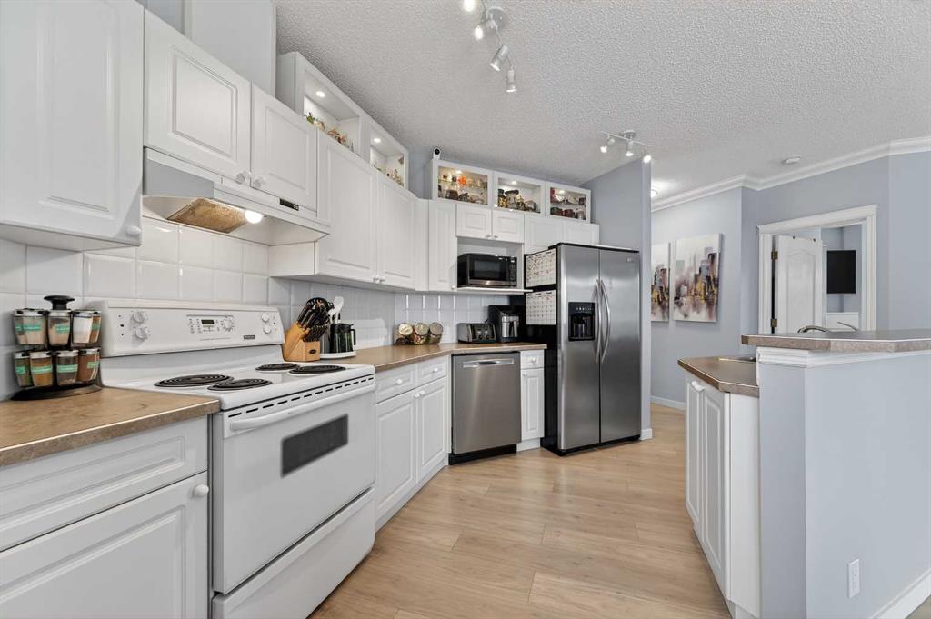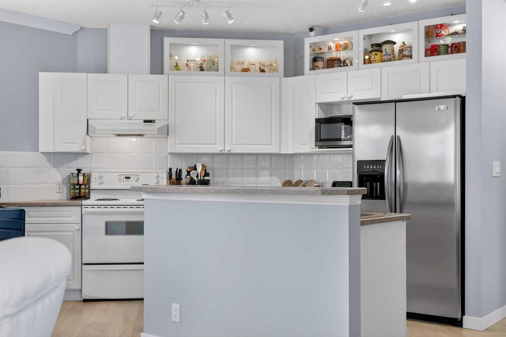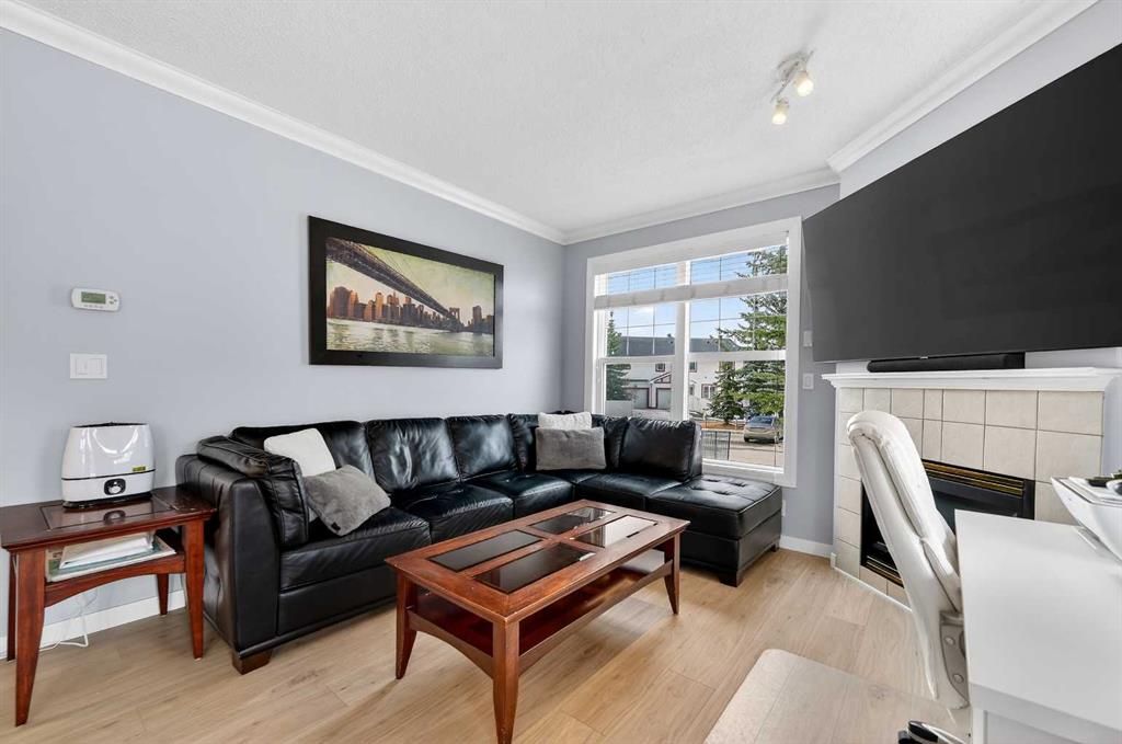 Welcome to this meticulously maintained main-floor condominium located in the highly desirable Highcastle complex, where comfort, convenience, and pride of ownership come together beautifully. Recently refreshed with brand new flooring and crisp new paint, this bright and inviting home showcases a modern, clean colour palette that feels both timeless and welcoming. Perfectly positioned at the end of the complex, this exceptional unit enjoys corner placement with additional windows, filling the home with natural light and creating a bright, airy atmosphere throughout. The charming brick patio walk-out offers direct access to the courtyard greenspace and nearby parking, creating a wonderful outdoor extension of your living space. A spacious foyer welcomes you inside, immediately showcasing the care and attention these owners have given the home. Warm luxury wood laminate flooring leads you into a thoughtfully designed open floor plan centered around a bright and functional kitchen. Crisp white cabinetry, tall upper cabinets with accent lighting, and a clean white subway tile backsplash create a fresh, contemporary feel. The central island with raised eating bar is perfect for casual dining, morning coffee, or gathering with friends. Large windows invite an abundance of sunlight into the generous living room where a corner gas fireplace with tile surround and mantle creates a cozy focal point, perfect for relaxing evenings at home. This well-designed layout offers two spacious bedrooms, thoughtfully separated for privacy. The primary bedroom features a large closet and a private three-piece ensuite, while the second bedroom is equally bright and inviting. Both bedrooms include ceiling fans for enhanced comfort and airflow. A full four-piece main bathroom, separate laundry room, and additional storage room complete the interior. Practicality meets comfort with a titled underground parking stall, making winter mornings effortless. A large private storage space conveniently located behind the stall adds even more functionality. With its premium exposure overlooking greenspace and a covered brick walk-out patio, this home offers the rare benefit of main-floor accessibility combined with privacy and outdoor enjoyment. The Highcastle complex truly feels like home, and its location is unbeatable—just steps from the vibrant amenities of High Street where you’ll find restaurants, groceries, cafés, fitness studios, and everyday conveniences. Commuting is also easy with quick access to Deerfoot Trail and 52 Street. This beautifully maintained condo offers the perfect blend of style, comfort, and location—an exceptional opportunity to enjoy effortless living in one of the area\'s most convenient communities.