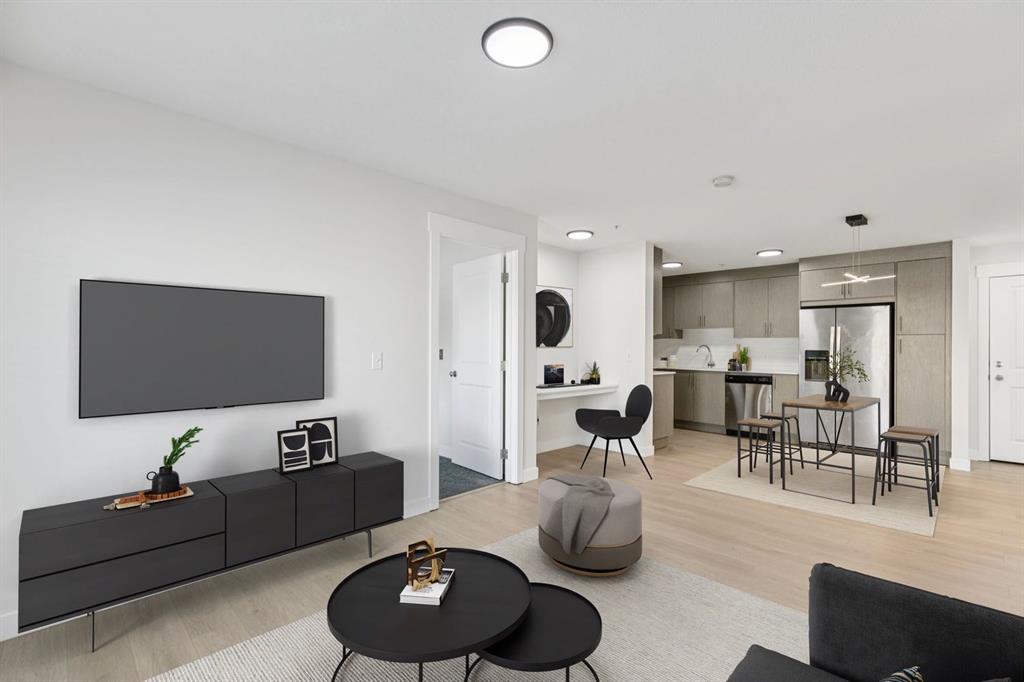 The kitchen features durable quartz countertops and stainless steel appliances, with ample storage and counter space for culinary creations. The open floor plan seamlessly connects the kitchen and living room, offering plenty of space for a dining table and ideal for entertaining. A built-in desk provides convenience for work-from-home needs or a cozy reading nook. The primary bedroom serves as a retreat, lots of natural light fills the room from the large window framing park views, while his/ her closets and 4-piece ensuite enhance privacy and comfort. The versatile second bedroom also enjoys a park view, making it perfect for children, guests or a home family room with its own large closet for added storage.