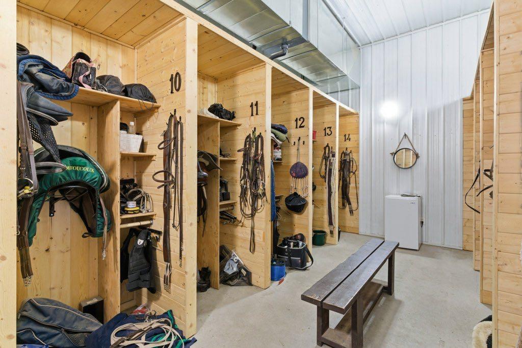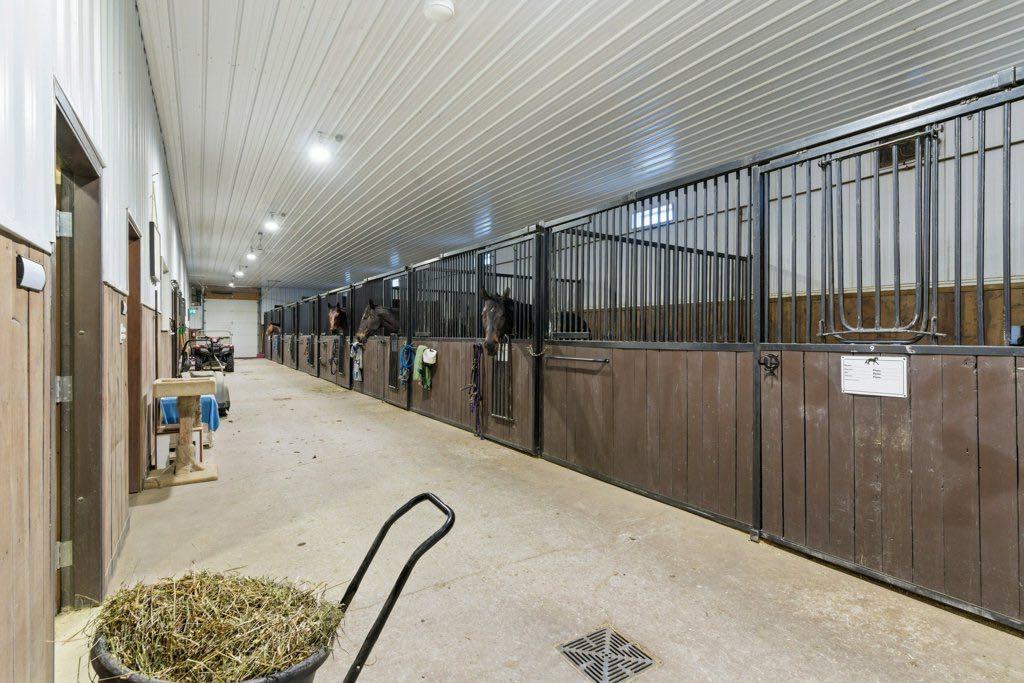 At the heart of the property is a state-of-the-art 80 by 200-foot heated indoor arena, designed with premium waterless footing to ensure excellent traction and minimal maintenance. Equine-specific LED lighting brightens the space, allowing for year-round riding and training in any weather. Connected to the arena is an impressive barn, featuring in-floor heating and 16 spacious 12x12 stalls. The barn is thoughtfully outfitted with two well-appointed tack rooms, two bathrooms, two offices and kitchen. For equine care there’s a wash bay with overhead hose boom, laundry and blanket storage and dedicated jump storage storage room, offering everything needed to support a high-functioning equestrian facility.