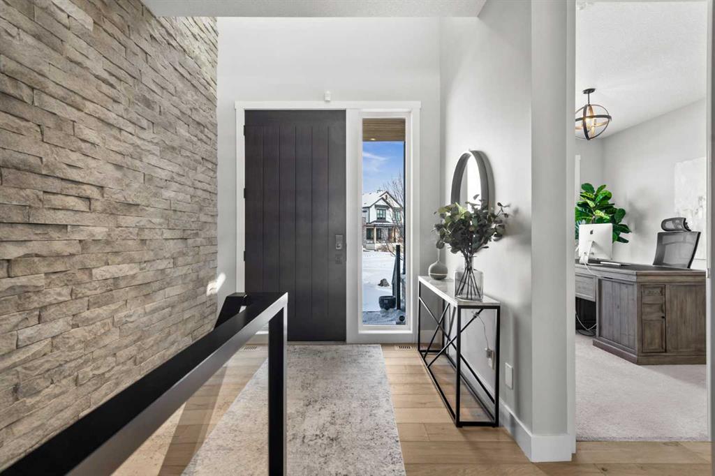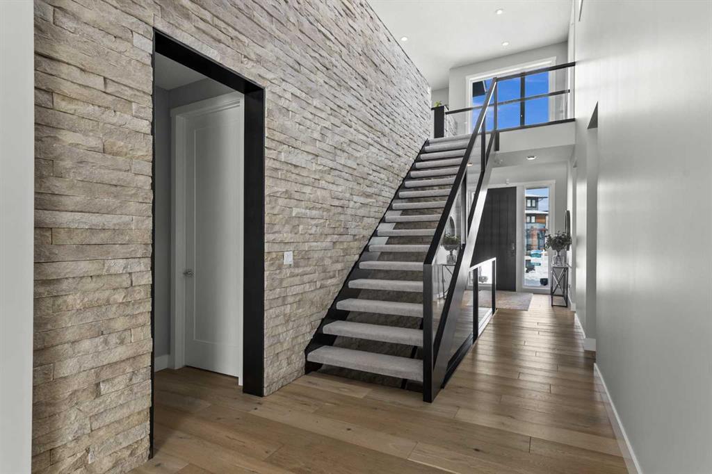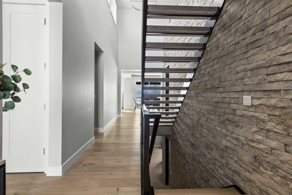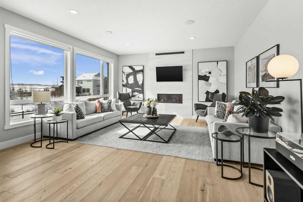 Set on one of the largest pie lots in Harmony and backing onto scenic pathways and open farmers’ fields, this exceptional home captures unobstructed mountain views and breathtaking sunsets across the open landscape. Located on a quiet street within walking distance to the future school and a short distance to the lake. The setting offers an ideal balance of peaceful surroundings and everyday convenience. The home makes a striking first impression with a dramatic rock feature wall and open staircase drawing your eye through the main living spaces toward the backyard and views beyond. The main floor is bright and open with large windows filling the home with natural light while framing the landscape behind the property. At the heart of the home is an impressive kitchen featuring a premium Miele appliance package including gas cooktop, two dishwashers, quartz countertops, and a well-appointed butler’s pantry providing excellent prep and storage space. Modern cabinetry and refined finishes give the kitchen a polished contemporary feel while the quartz island anchors the space and connects seamlessly with the dining and living areas. The dining area features a beautiful wood ceiling detail and designer lighting above the table, while the living room is centred around a modern fireplace finished with striking tile detail and expansive windows overlooking the backyard and open landscape beyond. A private front office, powder room, and mudroom with built-in lockers and storage complete the main level. Upstairs, a spacious bonus room provides additional living space. The primary suite is a true highlight of the home, positioned to capture the open views behind the property, with large windows framing farmland and expansive skies. The ensuite offers a relaxing retreat with freestanding tub, oversized glass shower, double vanity, and elegant tile work, while the walk-in closet with built-ins connects directly to the laundry room. Two additional bedrooms and a full bathroom complete the upper level. The fully developed basement is designed for entertaining and recreation with a theatre area and custom bar featuring waterfall island, beverage fridge, and double keg system. A spacious dedicated home gym provides an outstanding fitness space rarely found in homes. The basement also includes a fourth bedroom, full bathroom, additional powder room, and generous storage. Outside, the backyard takes full advantage of the pie lot with a three-tier deck offering outdoor living areas including a covered screened seating space, lounge area with fire pit, and outdoor cooking space. A custom-built sport court creates an incredible space for basketball/pickleball/hockey, and recreation. Additional highlights include an oversized tandem garage with built-in storage, underground irrigation, 2 air conditioning units, EV charging plug, cedar fencing, matching exterior shed, built-in basement speakers. A rare opportunity to own a thoughtfully designed home on one of Harmony’s most desirable lots.