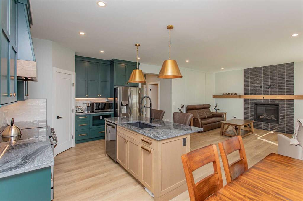 The heart of the home is the chef-inspired kitchen, featuring rich green cabinetry, sleek brass hardware, statement lighting, and a striking countertop island with seating. Open to the dining and living areas, it’s an entertainer’s dream with seamless flow for family gatherings or cozy nights in by the fireplace.