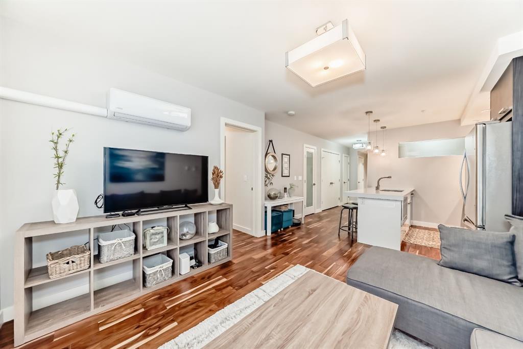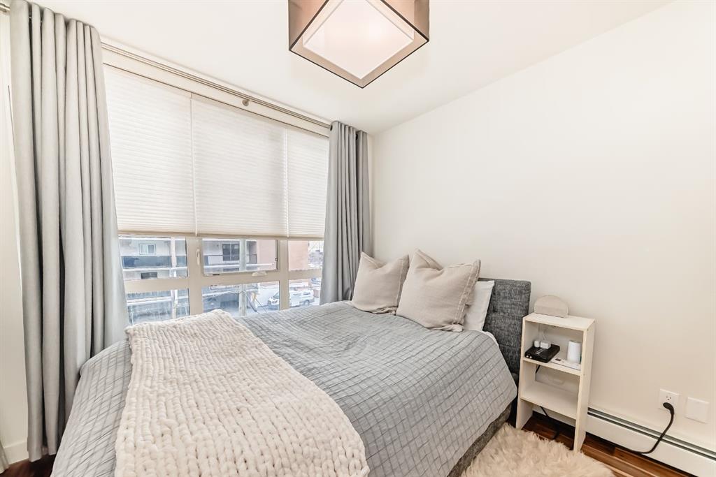Excellent professional and or investor condo ((short term rentals allowed) in a prime area of Connaught/Beltline. Sunny south unit direction with air conditioning ($10000 option). Two bedroom, two full bathrooms (Ensuite and guest bathrooms), spacious living room, kitchen with dining, eating bar area, upgrade features include: quartz countertops, engineered hardwood flooring, spacious open plan, 9 foot ceilings, in suite laundry, spacious deck, one rear lot parking stall, beside rear access door. Bedroom 2 fits a bed. No exterior window and closet is in hallway. Extra storage locker in parkade area Location is close to everything downtown: restaurants, coffee shops, etc. but location is still quiet at night - away from the noise of the nightlife.