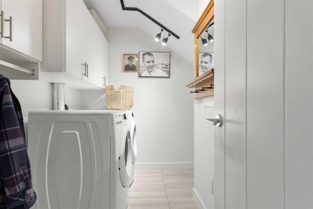 Also on the main floor is the first of two primary bedrooms. This room features a walk-through closet with built-in closet organizers leading to a private ensuite complete with a walk-in shower, soaker tub, and dual vanities. A powder room and a laundry room with additional storage complete the main level.