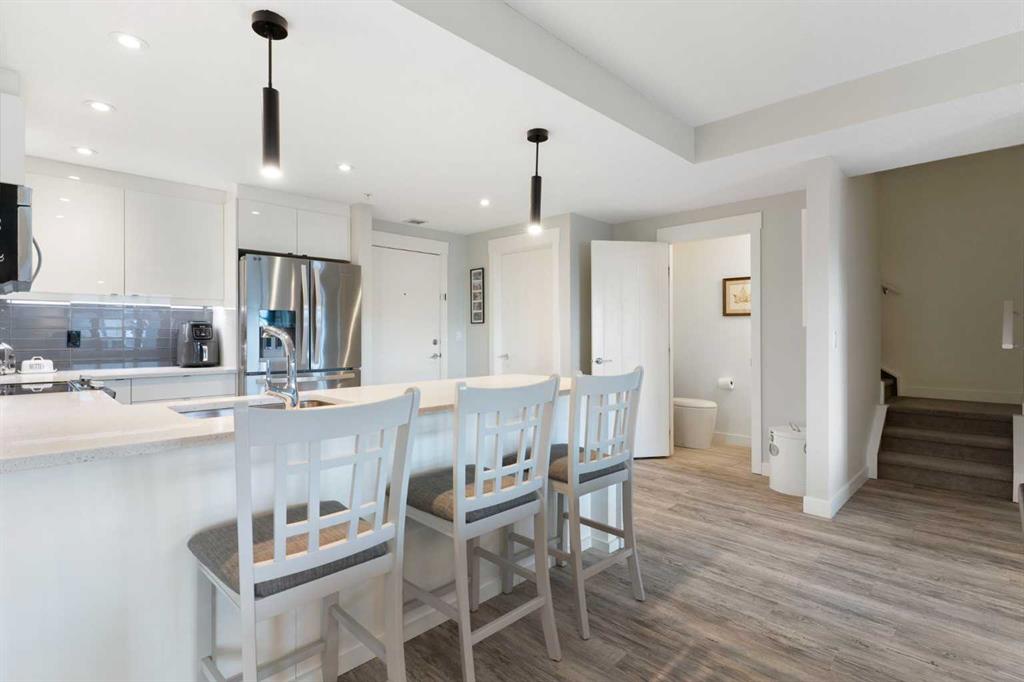 This very well-maintained 1,434 sq ft unit offers a functional and comfortable layout over two levels, featuring carpet and vinyl plank flooring, updated lighting, and an abundance of natural light throughout the home.