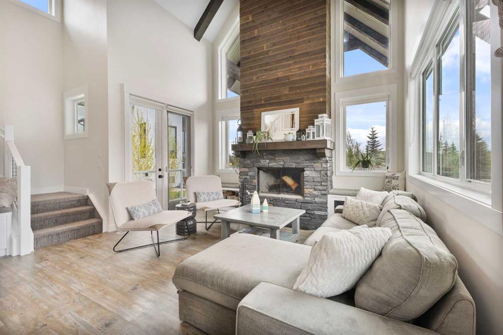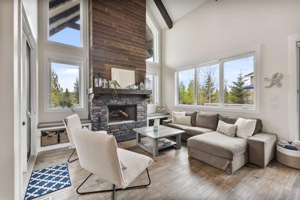 Upstairs, you’ll find a cozy bunk room that sleeps four, perfect for kids or guests, alongside the primary bedroom and a 3-piece bathroom. The fully finished basement extends your living space with a generous recreation room and hosts the laundry area, offering both comfort and practicality. The magic continues outdoors where a wraparound deck invites you to host unforgettable gatherings under the stars. Lounge by the second wood-burning fireplace, unwind in the inflatable hot tub, or simply soak in the peaceful surroundings of this dark sky community. A separate carriage house offers even more flexibility, featuring its own coffee bar, queen sized bunk beds, and another 3-piece bathroom – perfect for hosting extended family, guests, or creating a private retreat space. As part of this exclusive lakeside community, you’ll enjoy unmatched amenities including lake access, an indoor pool, hot tub, tennis courts, fitness facility, community dock, kitchen, and beach volleyball courts – all set against the stunning backdrop of the Rocky Mountains.