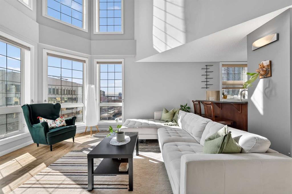 This 2-storey penthouse stands out the moment you walk in. Two-storey windows and southwest exposure flood the living space with natural light, while views stretch across downtown to the north and west. Remote blinds add comfort and control throughout the day.