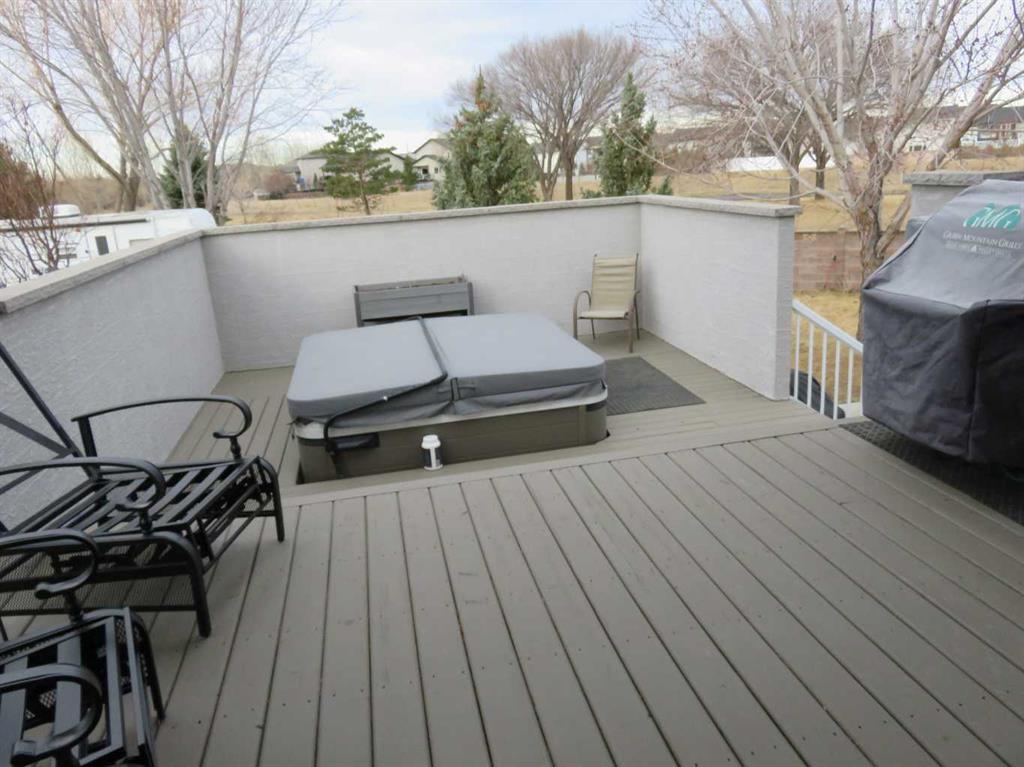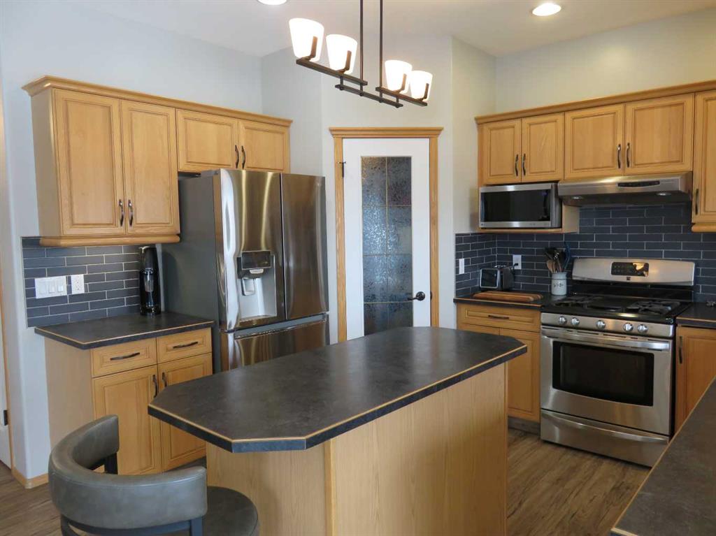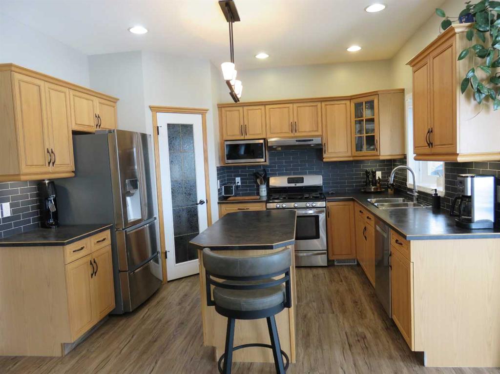 Unique 2 story fully developed, renovated with four bedroom up, quiet court location, backs onto city park and trail with back alley access. Large pie shaped lot with front RV parking 12\' to 19\' wide 40\' deep. Spacious front landing, Beautiful oak kitchen/under cabinet lighting/island, walk in pantry, kitchen appliances are stainless steel fridge, gas stove, microwave, built-in dishwasher. Great room with gas fireplace, dining nook garden door to two tier covered deck/gas line for your bbq/under deck storage. Including Hot tub (permitted) on open deck. overlooking landscaped yard with trees and perennial, underground sprinklers and designer cinder block fence. Main floor laundry/den with closet, including washer & dryer. Upper level with 4 bedrooms, a huge primary bedroom for your king size bed and extra seating area. Bright 5 pieces Ensuite with double vanity, granite counter, large tile shower 5\'6\" X 3\'4\" with glass door, bathtub. Main bath 4 pcs. with granite counter and sky light. Three more bedrooms. Basement developed with large family room/gas fireplace. Including built in entertainment system with seven speakers and wall TV. 3 pcs. bathroom. Attached 24\' X 28\' garage, ceiling 13\' high, with floor drain and utility sink. Side RV parking. 24 triple glazed windows and coverings new in 2024. House with newer paint. Large back yard for your extra garage or swimming pool. Minutes walk to Leisure center, Co Op, restaurant, shopping and schools etc.