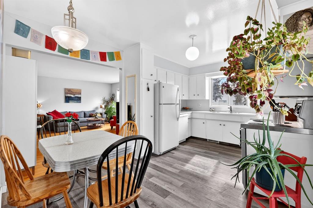The main floor boasts over 1050 sq. ft. of meticulously maintained living space, complete with original hardwood flooring and updated vinyl in the bright, functional kitchen. Fresh, neutral paint throughout creates a clean and inviting atmosphere. The spacious living room is filled with natural light from large windows and flows seamlessly into the kitchen and cozy breakfast nook.