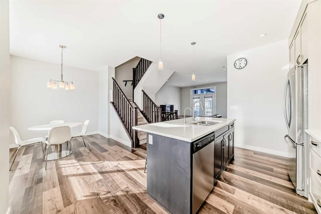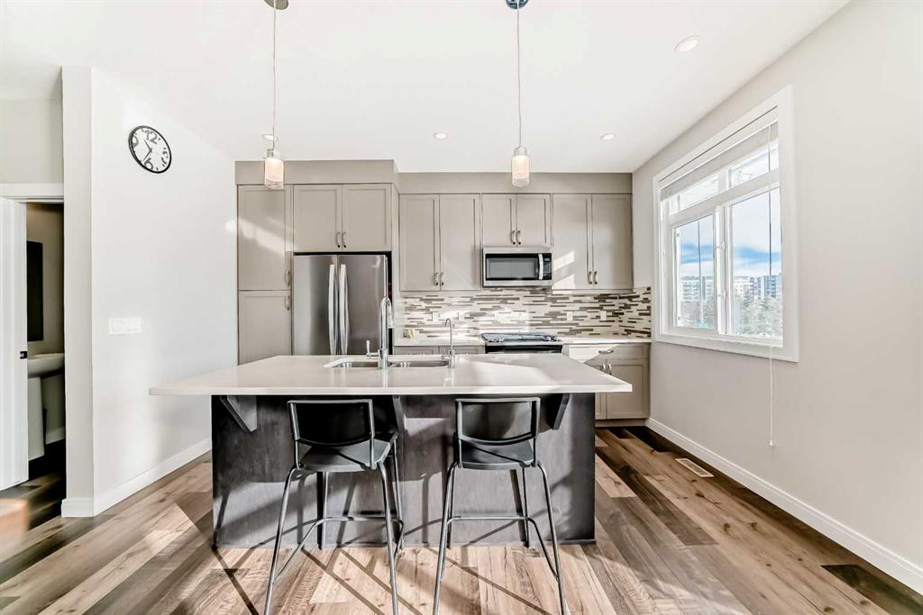 Located in the desirable community of West Springs, this well-maintained three-storey townhouse offers bright, functional living space throughout. The entry level features 9-ft ceilings, tile and laminate flooring, and a spacious den/office. The main floor showcases 9-ft ceilings and laminate flooring, with a generous kitchen featuring quartz countertops, stainless steel appliances including a gas stove, and a large island with a flush eating bar. The open layout flows into the dining area and spacious living room with a study nook/additional paly area, plus a 2-pc bathroom and access to the west-facing balcony. Upstairs offers two huge primary bedrooms, each with a walk-in closet and private ensuite. One ensuite includes double sinks, a soaker tub, and separate shower. Laundry is conveniently located on this level. The fully finished basement adds a third bedroom, a 3-pc bathroom, and a long storage room.