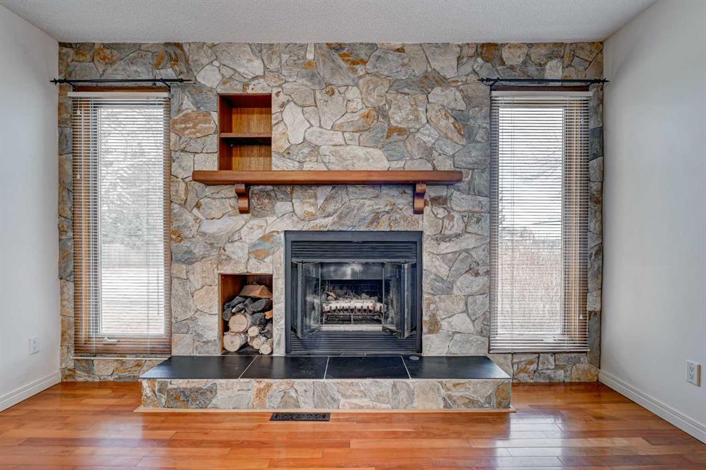 The bright and functional main floor showcases an open-concept kitchen and dining area, along with a welcoming family room anchored by a cozy wood-burning stone feature fireplace overlooking the sunny front yard. This level also includes two bedrooms, including a primary with ensuite, a full bathroom, and a versatile office/den.
