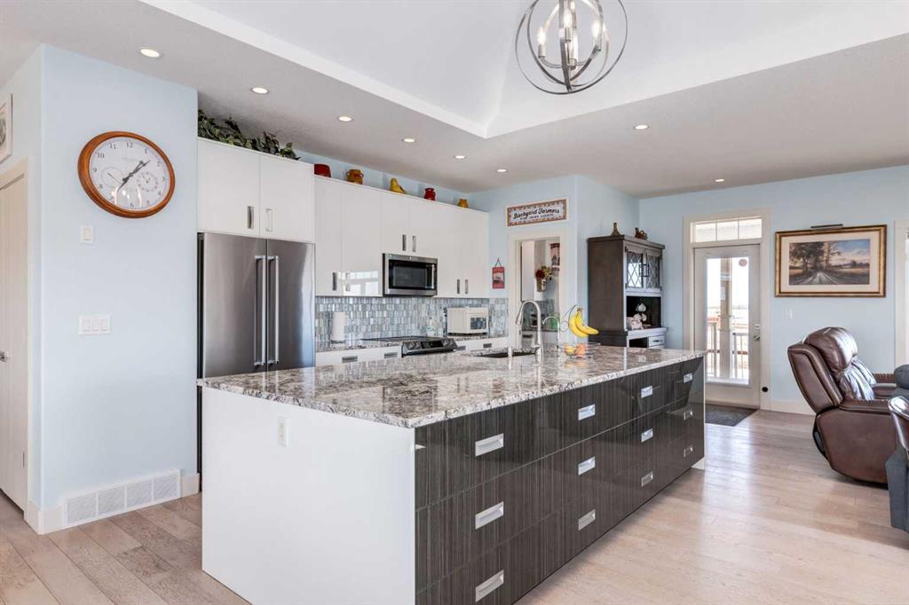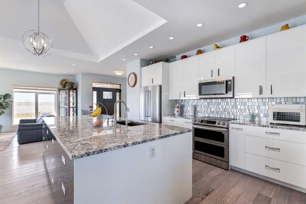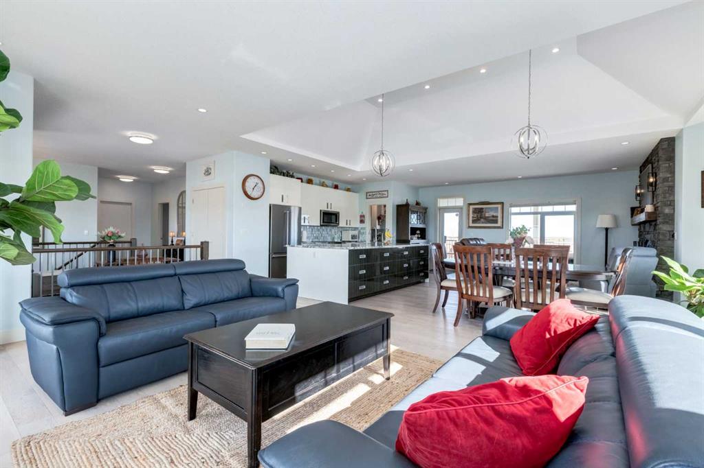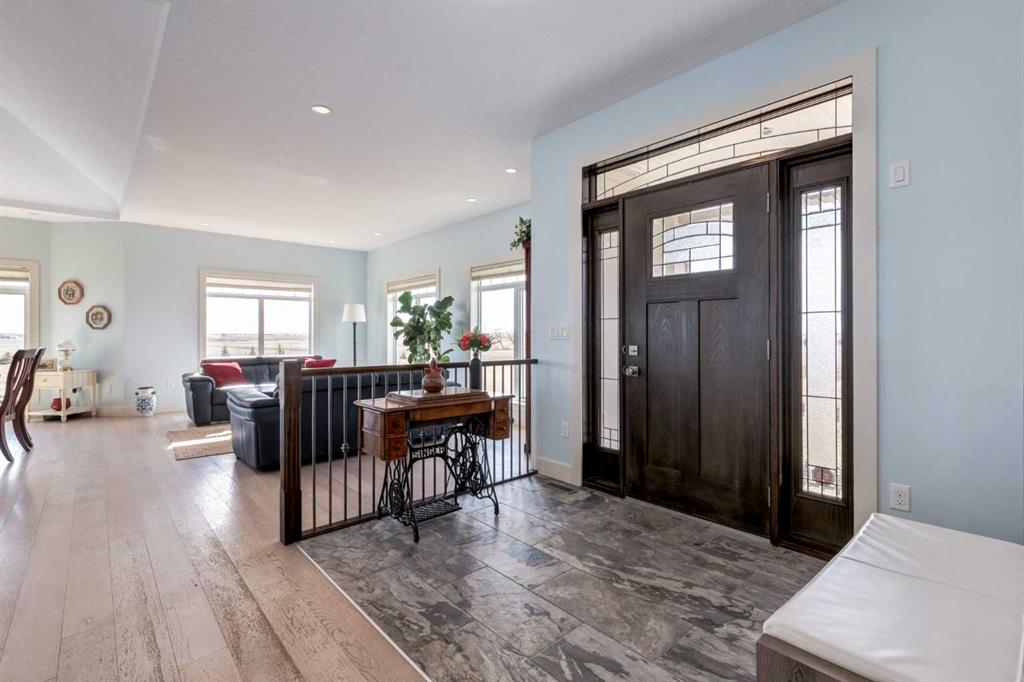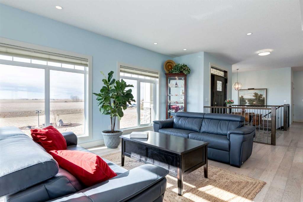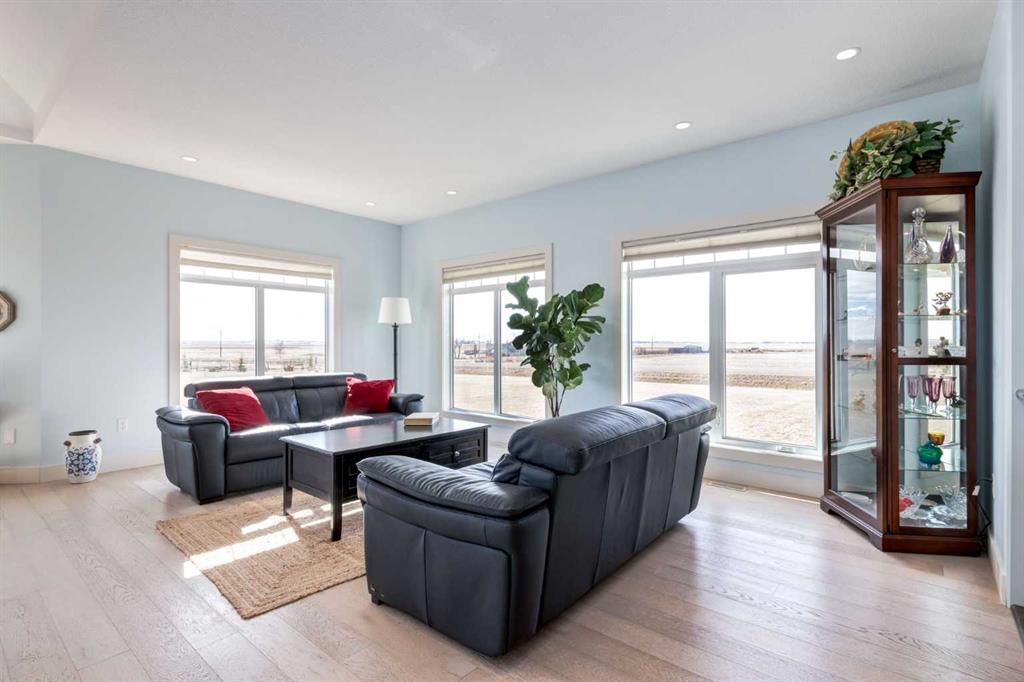 Country Living at its finest with a short 15 minute drive to Strathmore and 45 minutes to Calgary! Situated on 3 acres with serene prairie views, this beautiful home offers 4,051 SF of developed living space with 6 bedrooms and 3 bathrooms, allowing an abundance of space for the growing family. The bright and open main floor features high ceilings, tile and wide-plank hardwood flooring, spacious front living room leading to the Chef\'s kitchen showcasing stainless steel appliances (stove can be switched between induction or gas very easily), large island with storage accessed from both sides, granite countertops, two toned cabinets with plenty of drawers and easy close slides and a butler\'s pantry with ample shelving and a sink. The dining area gives access to the deck and the rear family room is the perfect place to gather around the wood burning fireplace on those cold, winter days. The vaulted ceilings over the living, dining and family room with surround windows allow for expansive mountain views and year round enjoyment of beautiful sunrises and sunsets. The Primary bedroom is complete with a 5 piece ensuite, walk in closet and a private access to the covered deck. Two additional guest bedrooms, 4 piece bathroom, mudroom and conveniently located laundry room complete this level. The basement is finished with cozy in-floor heat, an over-sized family room with wood burning stove, 3 generously scaled bedrooms, a 4 piece bathroom and a home office with french door access. Don\'t overlook the attached TRIPLE garage (with in-floor heat), Reverse Osmosis drinking water tap, central AC for those hot summer days, 24 solar panels with Tesla battery The septic field was expanded in 2021 as well as a second septic field and electric meter installed on the property offering great potential development for a shop or additional living quarters. Storage sheds, greenhouse, a vegetable garden, and 2 chicken coops allow you to enjoy the extra benefits of acreage living! Additional highlights include the school bus that stops at the end of the driveway and dust prevention on road. Nothing to do but move in and enjoy...book your showing today!