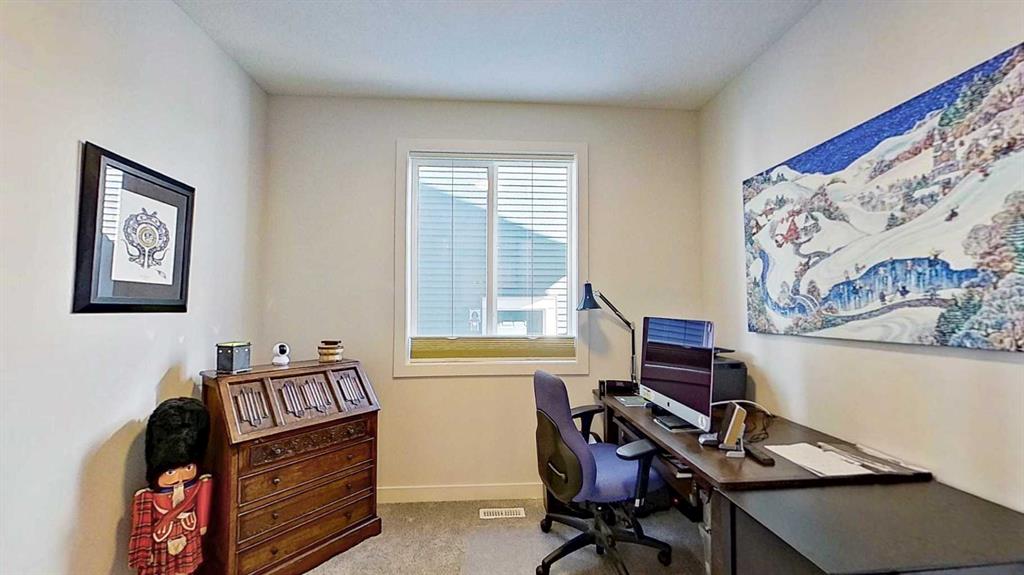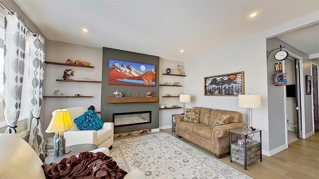 Rocky Mountain views from this 2,016 sq. ft. detached home located in Sunset Ridge, Cochrane. The home features a south-facing front exposure, a fully fenced backyard, and backs onto a planned pathway. Interior features include 9-foot ceilings, engineered hardwood flooring, and large windows providing natural light. The kitchen includes a quartz island, quartz countertops, and upgraded appliances. The great room includes an electric fireplace, and the home is equipped with central air conditioning. Upstairs, the primary bedroom includes a walk-in closet, 5-piece ensuite, and access to the laundry area, along with a loft space. The main floor includes a flex room with double doors suitable for office or hobby use. Additional features include a double attached garage, landscaped and fenced yard, and an unfinished basement. Located within walking distance to a planned community centre and future school, near RancheView K–8 School and St. Timothy High School, approximately 30 minutes to Calgary, approximately 40–45 minutes to the Rocky Mountains, and minutes from downtown Cochrane.