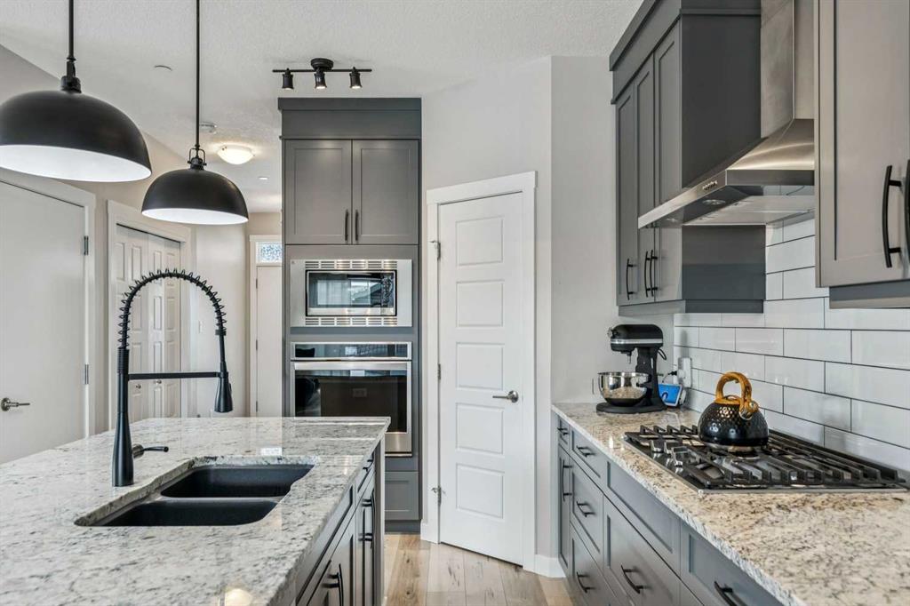 The kitchen is a true highlight, featuring a gourmet upgrade with quartz counters, a large island, gas cooktop, built-in oven, and plenty of storage. It’s built for both everyday living and hosting.