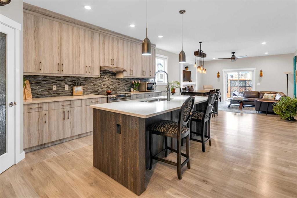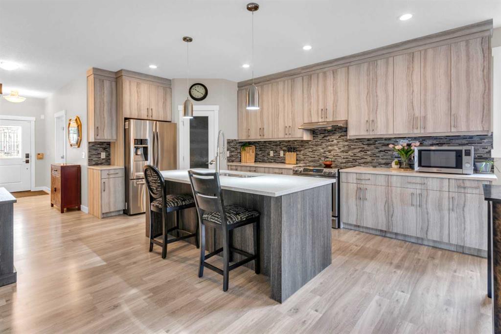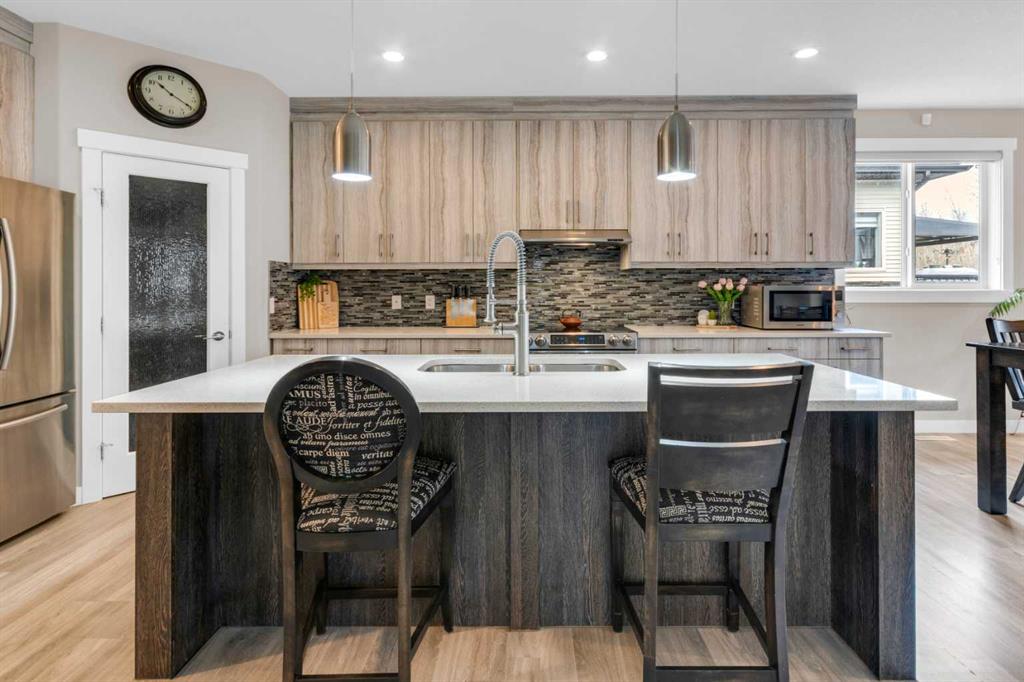 MODERN LUXURY meets SMALL TOWN SERENITY in this show-stopping, fully finished Bungalow with the ultimate TRIPLE ATTACHED DREAM GARAGE & expansive backyard! A massive driveway and covered Front Porch set the tone before stepping inside to a thoughtfully designed entry. The front Foyer flows into an organized walk-in closet for coats, and Mudroom, where there’s a second oversized closet with shelving tucked discreetly behind French doors —keeping everyday life beautifully organized & out of sight. A bright front Office with a large window offers the perfect work-from-home space. The heart of the home is a magazine-worthy Kitchen! Showcasing full-height custom cabinetry that extends seamlessly to the ceiling, a timeless tile backsplash, elegant stone countertops, rich contrasting eat-up island with a sink that creates the ideal gathering space, complemented by SS appliances including an electric range (gas line in place), AND a spacious corner Pantry. Ok, SOLD?! But there’s so much more… The Dining area connects effortlessly to the inviting Living Room, where a striking gas fireplace with floor-to-ceiling stonework and custom built-in cubbies, shelves & mantle create a warm and sophisticated focal point. Step outside through the large sliding doors to a spectacular two-tiered, partially covered deck with gas line for BBQ, privacy feature wall, and sweeping views of the huge, fully landscaped & fenced backyard. Mature trees, a storage shed, and a spacious side yard perfect for a dog run complete this outdoor retreat. The Primary Suite is generously sized and beautifully finished, with a luxurious 5-pc Ensuite with dual sinks, tiled floors, a JETTED SOAKER TUB beneath the window, an O/S walk-in shower, and a big walk-in closet with built-in organization. Finishing-off the main floor is a 2nd spacious Bedroom, a 4-pc Bathroom with stone counters & vanity storage, and a Laundry Room with tile flooring & French doors. The FULLY FINISHED BASEMENT continues the home’s elevated feel with LVP floors, tall ceilings, and recessed lighting. A cozy corner gas fireplace with full-height stone surround anchors the space, while TWO BIG bedrooms—both with WALK-IN closets—offer incredible flexibility! A wide hallway includes 220 wiring for the current corner SAUNA, leading to an elegant 3-pc Bath with an O/S tiled walk-in shower and modern vanity. This Basement has a GREAT layout, completed by a large storage area and utility room. Located in the welcoming community of Didsbury, on a GREAT Street, this home offers the perfect balance of small-town charm and everyday convenience—with excellent schools, parks, walking paths, and quick access for commuters. With its thoughtful layout, high-end finishes, incredible outdoor space, and standout triple Garage (that accommodates a half-ton truck no problem), this home is truly the complete package. Your dream bungalow awaits… Book your private viewing today!
