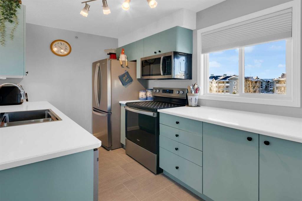 Welcome to MacKenzie Pointe—currently the only unit available in the complex. This top-floor, corner 2-bedroom, 1-bathroom condo offers added privacy with no neighbours above and just one shared wall. The bright, functional layout features an open living and dining area, with natural light from its corner position. The kitchen includes contemporary cabinetry and stainless steel appliances (2022), including a convection oven with air-fryer function, dishwasher, microwave/hood fan, and a refrigerator with bottom-drawer freezer. A farmhouse sink with pull-down faucet adds everyday practicality. Recent updates include a new washer and dryer (2025), upgraded lighting, updated switch plates, and ceiling fans in both bedrooms. Foil-lined sunshades in the kitchen and living room help maintain comfort year-round, while mirrored closet doors enhance light and storage. The bathroom features a professionally refinished bathtub for a clean, refreshed finish. The large, two-sided balcony offers space to relax or enjoy evening sunsets. This unit also includes titled, heated underground parking located near the elevator, complete with a secure storage area. Located in the heart of Airdrie, you’re within walking distance to shopping, restaurants, services, and Nose Creek Park. Condo fees include all utilities—electricity, heat, water, sewer, and waste removal—adding to the overall value. This is an excellent opportunity for buyers looking to step into low-maintenance condo living in a walkable, central location.