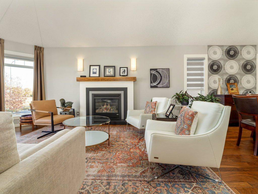 From the moment you enter, the quality of finish and attention to detail are evident. The main level is adorned with rich engineered hardwood flooring and enhanced by upgraded lighting throughout, creating a warm and cohesive aesthetic. The inviting living room is anchored by a gas fireplace and framed by expansive front windows with custom remote control blinds, capturing serene north facing views across a picturesque green strip, an ideal vantage point to enjoy natural light and local wildlife.