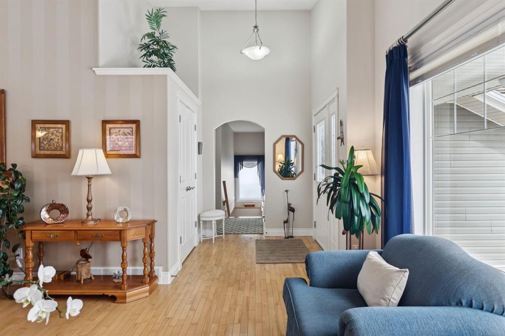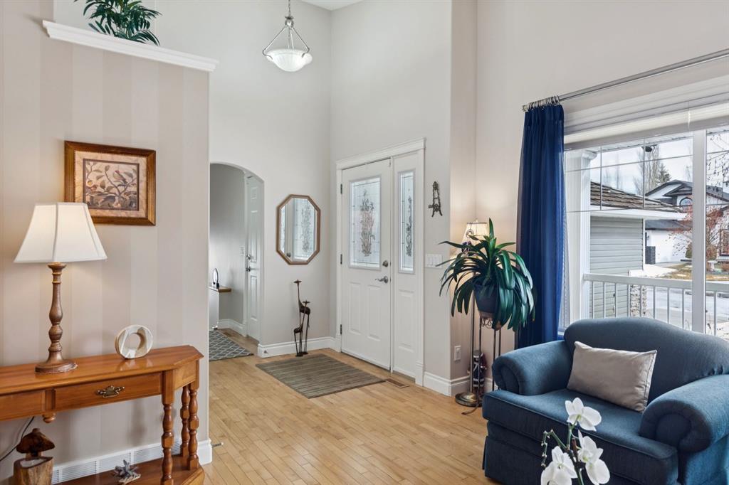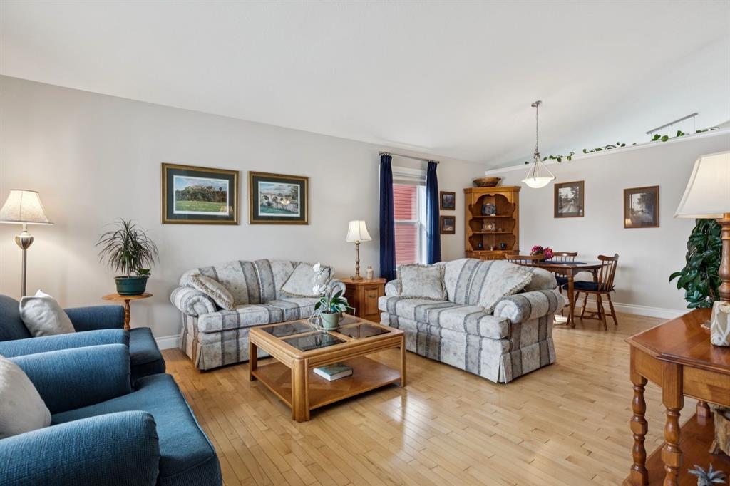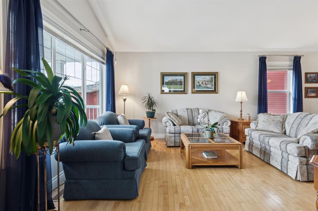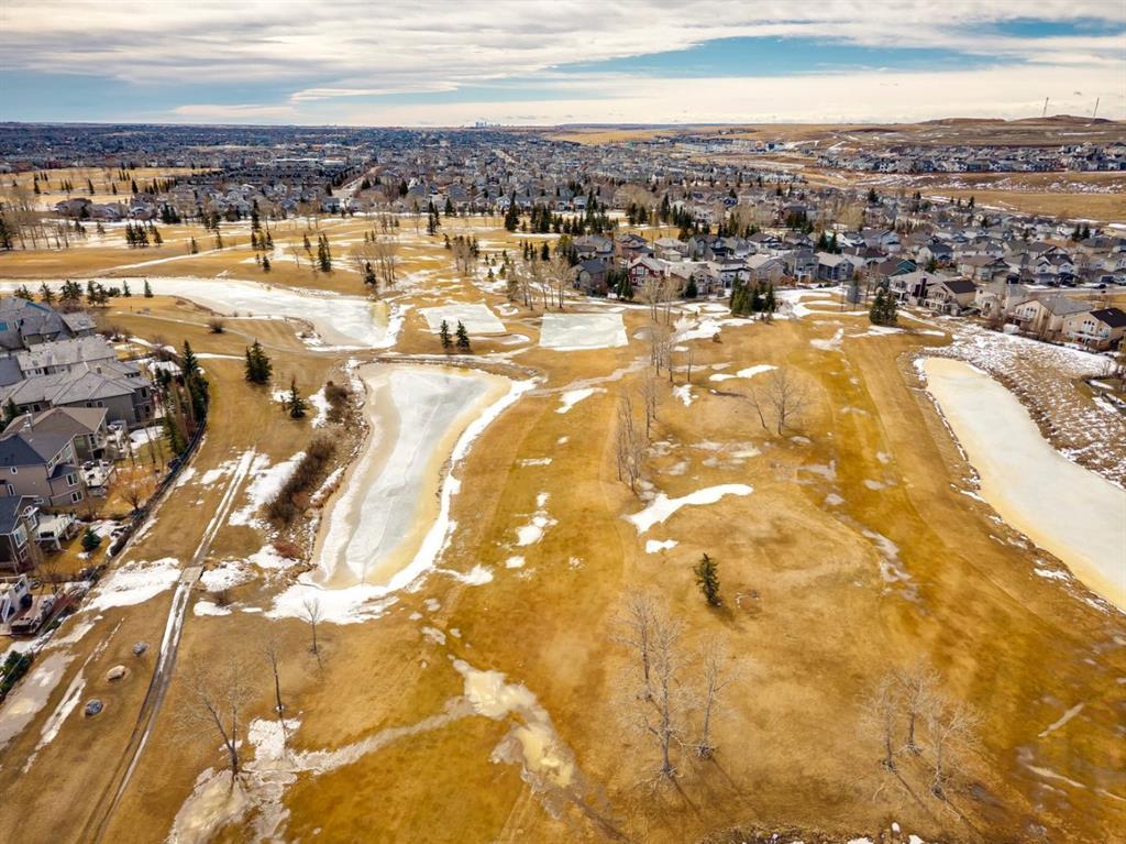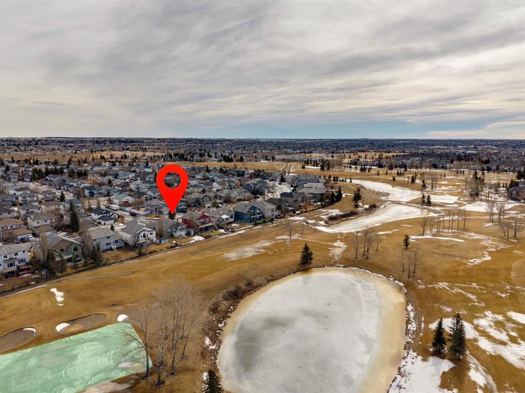 Welcome to a rare opportunity in the highly sought-after Woodside community—this original-owner bungalow, custom built by McKee Homes, offers an exceptional combination of quality, comfort, and an unbeatable location backing directly onto the picturesque Woodside Golf Course. Perfectly positioned on a quiet, low-traffic cul-de-sac, this home captures stunning west-facing views over two tranquil ponds and rolling greens, with no neighbours behind. Enjoy the peaceful setting year-round, with only seasonal golf activity for approximately six months of the year. Whether you\'re relaxing or entertaining, the elevated balcony deck is a standout feature—complete with a gas line for your BBQ, clear glass wind panels to preserve the views, and a power awning with remote for added comfort. Inside, the home boasts a bright and open layout enhanced by vaulted ceilings and an abundance of windows that flood the space with natural light. The kitchen is thoughtfully designed with granite countertops, built-in appliances, a central island with vacuum kick plate, and a cozy breakfast nook—all overlooking the golf course. Rich hardwood flooring flows throughout the main level, adding warmth and elegance. The spacious primary retreat offers serene views, a walk-in closet, and a full en suite. A second bedroom on the main level provides flexibility as a guest room, den, or home office—also enjoying those incredible west views. The main floor is completed by a large and functional laundry/mudroom with pocket doors, allowing you to keep everyday life neatly tucked away. The professionally finished basement features 9’ ceilings, upgraded carpet, and an inviting gas fireplace with a built-in entertainment unit. Two additional bedrooms with sunshine windows, ample storage, and a full bathroom make this level perfect for family or guests. Additional highlights include triple pane windows on the west-facing side for enhanced efficiency, double pane windows elsewhere, central vacuum system, a full blinds package, and a builder-finished basement. The oversized attached garage (25’5” x 23’) easily accommodates a full-sized truck, while the backyard offers plenty of space along with a storage shed. The front yard showcases a beautifully designed rock garden filled with perennials that create stunning seasonal curb appeal, complemented by a welcoming front deck—perfect for enjoying your morning coffee. Homes of this caliber, in locations like this, rarely come to market. With pride of ownership evident throughout, a highly functional layout, and breathtaking views, this is your chance to secure a truly special property in one of Airdrie’s most desirable neighborhoods.