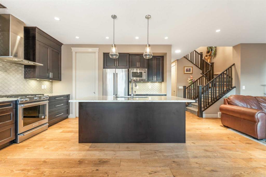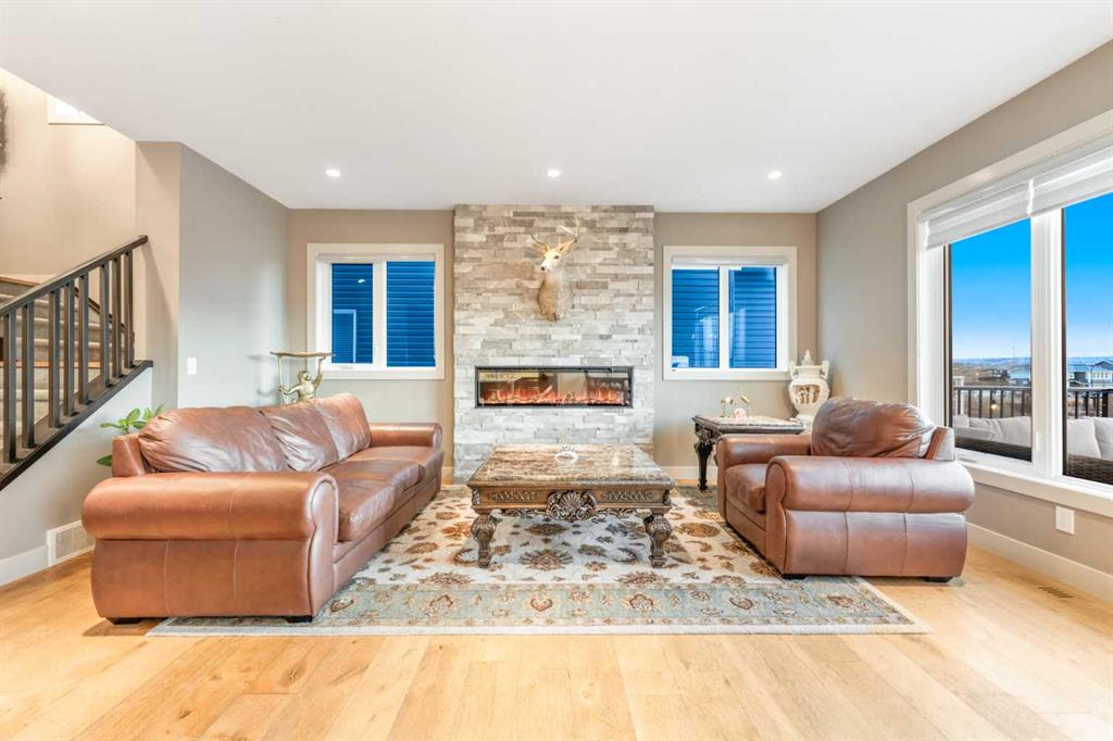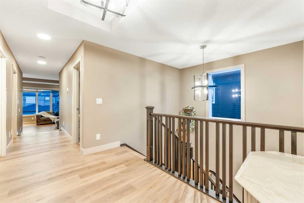 Welcome to this exceptional estate home, built by Arcuri Homes and crafted with superior quality and attention to detail that truly set it apart. Built on a higher-grade specification, this home features premium upgrades rarely found, including Lux Windows, solar panels, and durable stucco siding. Perfectly positioned backing onto a serene pond with a sunny west-facing backyard, this home offers breathtaking views and the ideal setting to enjoy evening sunsets and summer BBQs. The outdoor space is thoughtfully designed with concrete stairs, a stamped concrete patio, and a Duradek-finished deck conveniently located off the dining area. Inside, the home showcases hardwood flooring throughout the main floor, complemented by elegant 8-foot doors and 9-foot ceilings on both the main floor and in the basement, enhancing the sense of space and luxury. The chef-inspired kitchen is paired with a spice kitchen, perfect for heavy cooking while keeping your main kitchen pristine. The main floor also features a dedicated office/den, ideal for those who enjoy working from home. Upstairs, you’ll find a generous bonus room along with three spacious bedrooms. The primary suite is a true retreat, offering breathtaking pond views, a luxurious 6-piece ensuite with his-and-her sinks, a custom standing shower, a standalone Jacuzzi tub, and a large walk-in closet. The two additional bedrooms are also generously sized, perfect for family living. Upper floor laundry adds everyday convenience, making household tasks effortless. Wake up to ever-changing scenic views—from birds chirping in the summer, to a beautiful frozen pond in winter, and vibrant fall colours, with even the chance to enjoy aurora lighting from your bedroom. The fully developed basement features an illegal suite complete with one bedroom and a separate laundry, making it ideal for extended family or potential rental use. The double-attached garage is fully finished with insulation, drywall, and epoxy flooring, while the extended driveway accommodates up to 3 additional vehicles, providing a total of 5-car parking. Additional highlights include Gemstone exterior lighting, adding both beauty and functionality year-round. The location is truly unbeatable—just 10–15 minutes to CrossIron Mills Mall, 12–15 minutes to Calgary International Airport, and close to Carrington Plaza for everyday shopping. Entertainment is just around the corner with Landmark Cinemas only 9 minutes away, and easy access to Stoney Trail (Calgary Ring Road) ensures seamless connectivity across the city. This stunning home perfectly blends luxury, functionality, breathtaking views, and an incredible location, making it a rare opportunity you don’t want to miss. Call today to book your private viewing!
