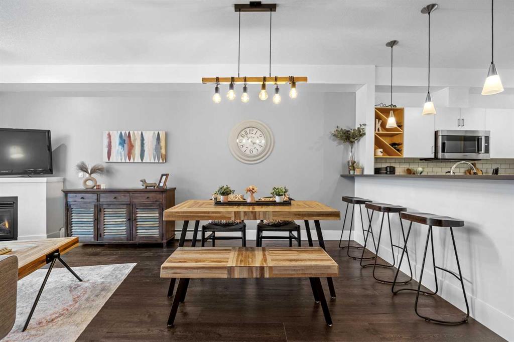 The UPDATED KITCHEN is designed to impress with QUARTZ COUNTERTOPS, a raised breakfast bar, HIGH-END STAINLESS STEEL APPLIANCES, and a built in wine rack — perfect for entertaining or unwinding after a long day. The SPACIOUS living + dining area features a COZY NATURAL GAS FIREPLACE, creating the perfect atmosphere year-round.