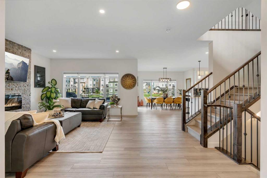 The main level features a stunning living room with a stone-accented fireplace, creating a cozy ambiance for family gatherings. The spacious dining area offers unobstructed views of the canal, providing the perfect backdrop for elegant entertaining. The chef-inspired kitchen is a showstopper, outfitted with built-in premium appliances, a gas range with a hood fan, a large island, ample pantry storage, and a convenient garbage disposal. A main-level bedroom/office and a full 3-piece bathroom add to the home’s functionality, along with a mudroom for added convenience.