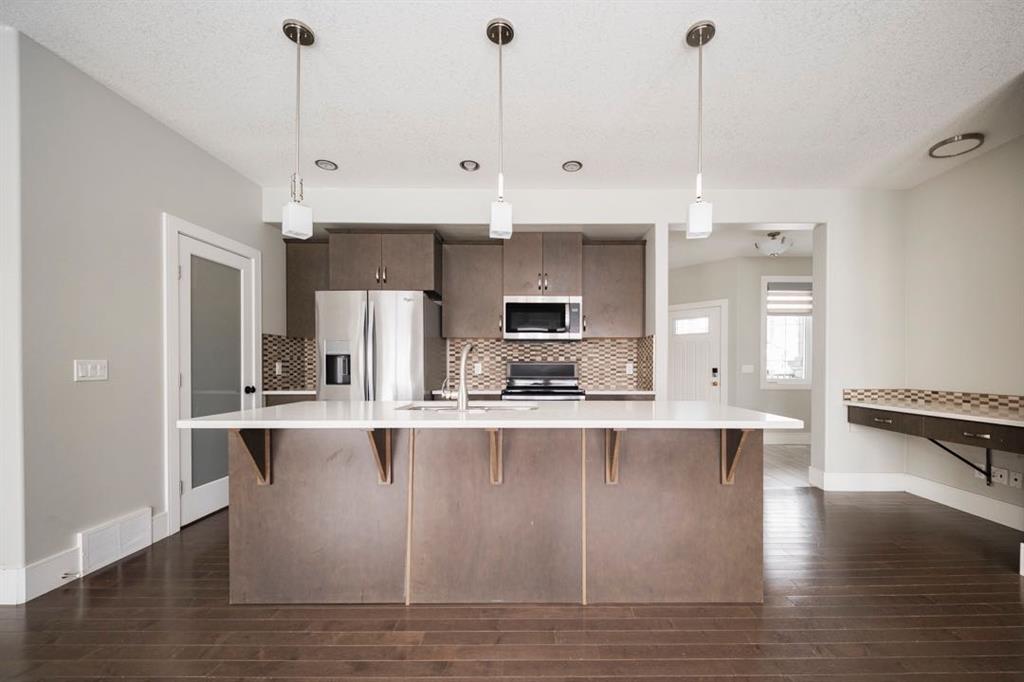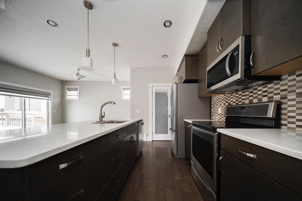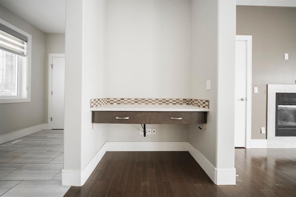 The main floor is designed for both comfort and practicality with a bright open concept layout and large windows that fill the space with natural light. The kitchen features quartz countertops, a large island, stainless steel appliances, a brand new microwave (2026), and a convenient walkthrough pantry with automatic lighting. One of the standout features of this home is the massive walk through coat closet connecting the front entry to the garage and garage to the pantry, complete with built in storage and a bench, creating the perfect drop zone for busy households. The living room is centred around a cozy gas fireplace, while a built in desk area near the entry adds even more functionality. A two piece powder room and access to the heated double attached garage complete the main level.