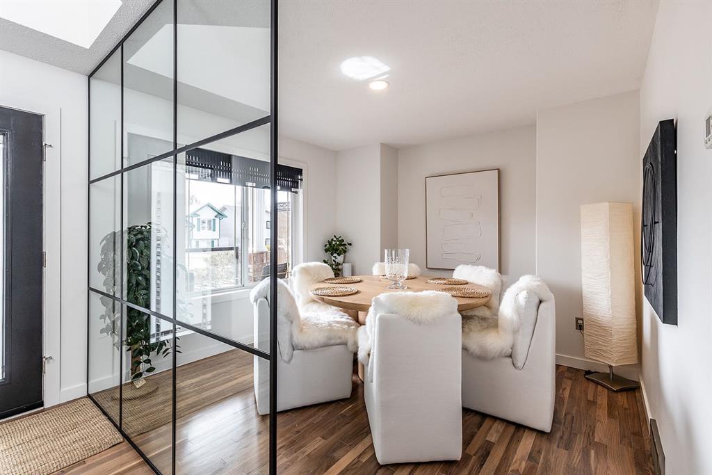 The open-concept main floor is both minimalist and striking, featuring rich walnut hardwood flooring and a beautifully designed kitchen where quartz countertops extend effortlessly into a full-height backsplash. Sleek KitchenAid Professional stainless steel appliances are integrated into the cabinetry and matte black fixtures add a bold, contemporary edge, while the dining area is elevated by a stunning modern glass wall—creating a bright, airy space perfect for entertaining.