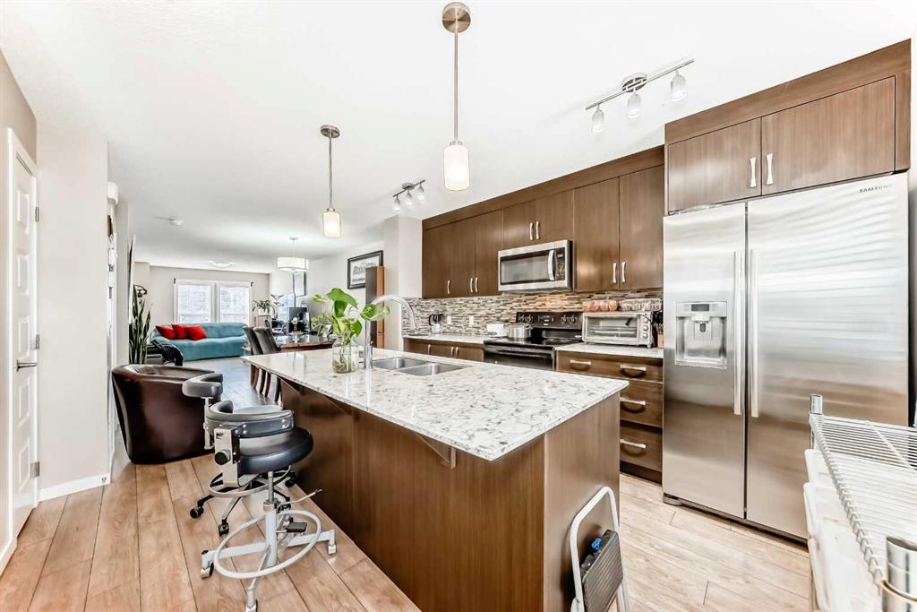 OPEN HOUSE ON STAURDAY & SUNDAY March 28 & 29 from 11:00 AM - 1:00 PM. Welcome to this beautifully maintained townhouse in the heart of Auburn Bay! Located just one block from all major amenities—including Superstore, restaurants, movie theatres, South Health Campus, and the largest YMCA in Calgary—this home offers unbeatable convenience and lifestyle. As you step inside, you’re welcomed by a spacious open-concept main floor featuring a bright living room, dining area, and modern kitchen. The kitchen is finished with quartz countertops, upgraded backsplash, and a brand-new refrigerator. Durable laminate flooring runs throughout the entire main level, creating a clean and cohesive look. Upstairs, you’ll find two generously sized bedrooms, each with its own full bathroom. The primary bedroom features a 4-piece ensuite, while the second bedroom offers a well-sized layout with its own 3-piece bath—perfect for guests, roommates, or family members. A standout feature of this home is the amazing attic storage space with pull-down hatch and foldable stairs—ideal for storing seasonal items and extra belongings. Additional highlights include: Private fenced yard; Newer hot water tank; Walking distance to the beautiful Auburn Bay Lake; Quick access to Exit 88, Stoney Trail, and Deerfoot Trail, Newly Paint, just clean the Furnace and Air duct. This home offers comfort, functionality, and an exceptional location—perfect for first-time buyers, small families, or investors.