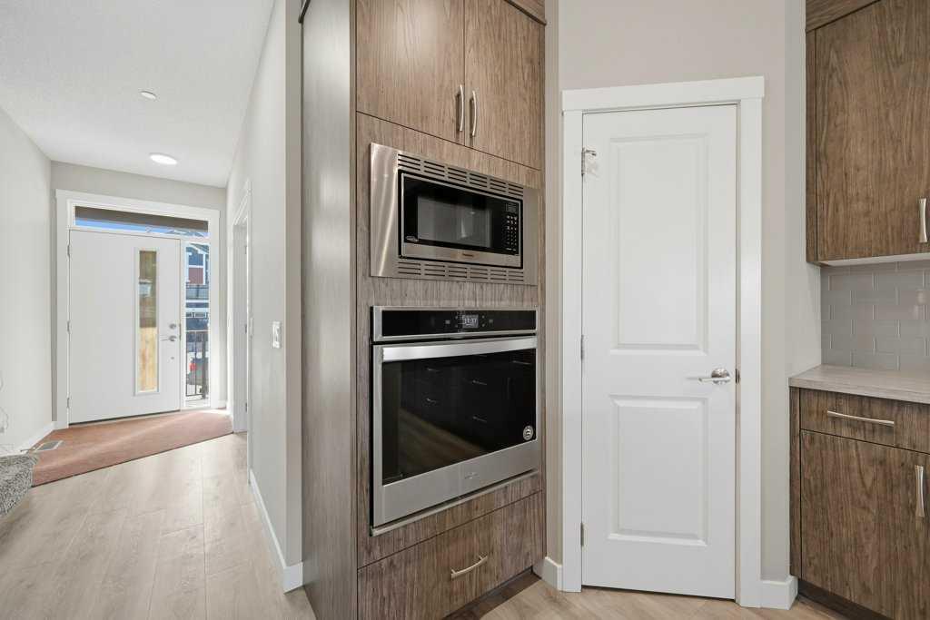 The chef-inspired kitchen is truly the heart of the home, showcasing ceiling-height cabinetry in a modern cream tone, an elegant full-height tile backsplash, high-quality countertops, and stainless steel appliances, including an electric cooktop, built-in oven and microwave, and range hood fan. A massive corner pantry adds extra convenience. The adjacent dining area easily accommodates an 8-seat table and flows seamlessly into the cozy living room, highlighted by large windows that flood the space with natural light.