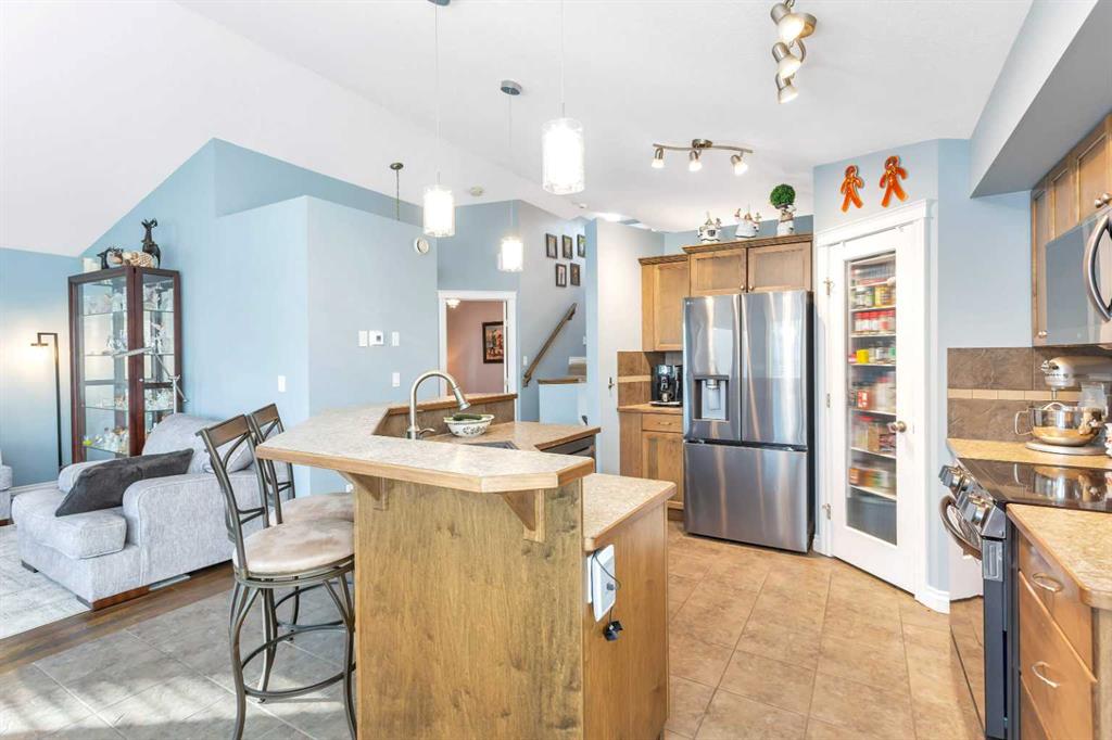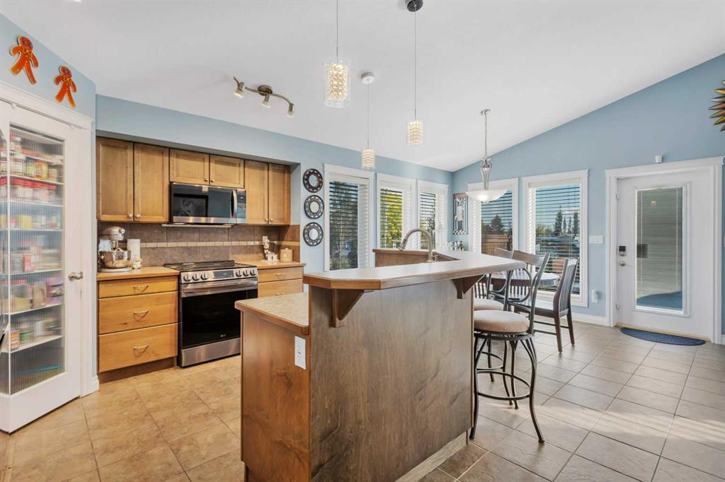 If you\'re looking for a bright and modern open concept fully developed home on a large south facing PIE LOT, 5 Heritage Drive could be it!! The inviting covered front entry opens into a spacious tiled foyer, with a built-in bench, shelving, plenty of natural light, and soaring ceilings. The open concept main floor includes vaulted ceilings and expansive south facing windows, flooding the space with natural light. The kitchen offers a perfect layout with generous counter space, a center island with a raised eating bar, a full tile backsplash, a walk-in corner pantry, and NEW STAINLESS APPLIANCES! The dining room is perfect for hosting large gatherings, with garden door access to the south facing, two tiered deck and backyard. There is a nicely connected and elegant living room featuring beautiful hardwood flooring, a feature gas fireplace, complete with a mantle, tile surround and lighted niche. There is a conveniently located main floor bedroom - perfect for kids or guests, or an ideal main floor office plus a full 4 piece main bathroom. The open staircase overlooks the main floor and leads to the primary bedroom, spacious enough to comfortably fit a king sized bed plus furniture, and features a generous walk-in closet with built in organizers and a spa-like ensuite complete with a corner tub and separate shower. Wide stairs lead to the fully finished basement with new vinyl plank flooring, roughed in floor heat, and large above-grade windows that fill the space with natural light. There is a generously sized family room, perfect for relaxing or entertaining. The basement also includes a spacious third bedroom, a stylish 3 piece bathroom with a walk-in shower and built-in shelving, plus laundry and ample storage space. Other great features include; Central air conditioning, central vacuum roughed in, upgraded sound proofing/insulation in the family room, and hot water on demand. Parking needs are taken care of with an attached double garage including two overhead doors. Enjoy the privacy with no rear neighbours this home backs onto a green belt with a walking trail that winds through town and connects to the new recreation area, offering fishing, sports courts, an all-wheels park, and the multiplex, as well as the secondary school and future middle schools. Enjoy life in the family-friendly community of Penhold, you\'ll be just minutes from multiple parks, playgrounds, schools and convenient shopping, all while being a short drive south of Red Deer.