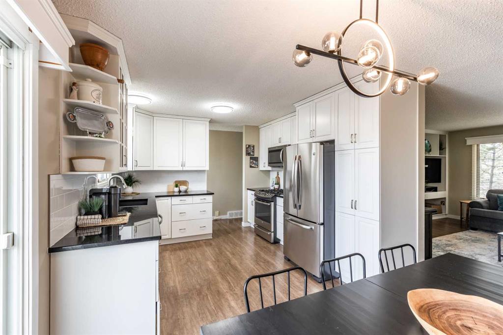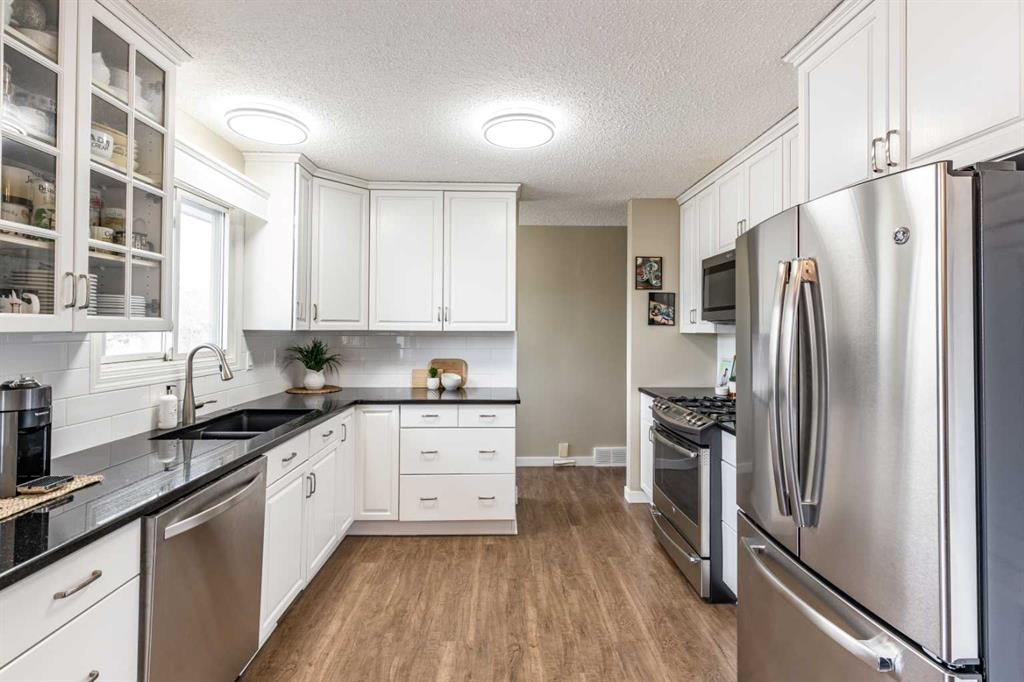 This beautifully maintained 5 Bedroom home has been upgraded throughout and offers a bright, open-floor plan that feels both welcoming and very functional. The spacious living areas are filled with natural light, while two fireplaces add warmth and character. Thoughtful kitchen and bathroom upgrades, updated doors, vinyl windows, and major mechanical improvements give peace of mind, including shingles replaced in 2021, a new hot water tank in 2024, and a high-efficiency furnace with central A/C installed in 2010. Outside, you’ll love the private, mature yard with established landscaping, fruit trees, flower beds, and underground sprinklers. Tucked into a quiet neighbourhood close to schools and parks, this property offers the perfect balance of comfort, privacy, and convenience. The detached double garage measures 24x26 with an 8-foot door, plus a double driveway off the front street for plenty of parking.
