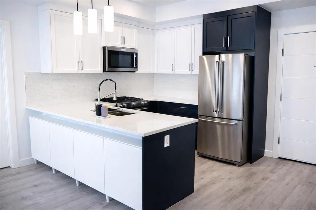 Welcome to the Springbank Hill community, known for its excellent schools and family-friendly environment. This beautiful area is bordered by a natural environmental reserve park with abundant walking trails and bike paths that connect throughout this vibrant and growing community. This new build condominium, Orion Condominium, is located at 85 Street and 19 Avenue SW. This fully upgraded open-concept TOP FLOOR unit is designed to highlight its large double balcony and double-pane windows. The home features a Lennox mini-split heating and cooling system, an efficient dual heating and air conditioning system professionally installed with permits. Luxury vinyl plank flooring with soundproof underlay runs throughout the living room, dining room, kitchen, bathroom, and primary bedroom. The European-inspired kitchen is finished with premium kitchen cabinetry, shaker-style cabinets throughout all bathrooms, soft-close drawers, marble quartz countertops, KitchenAid appliances (refrigerator, gas stove, microwave, dishwasher), stacked front-load washer and dryer, and a natural gas BBQ line installed on the balcony. Includes one titled parking stall and an oversized storage locker (75 sq. ft.) located beside the parking stall. Walking distance to Aspen Landing Shopping Centre with grocery stores, restaurants, cafes, clinics, and amenities. Quick access to Stoney Trail and Bow Trail, and close to 69 Street C-Train Station for easy downtown access, as well as Westside Recreation Centre.