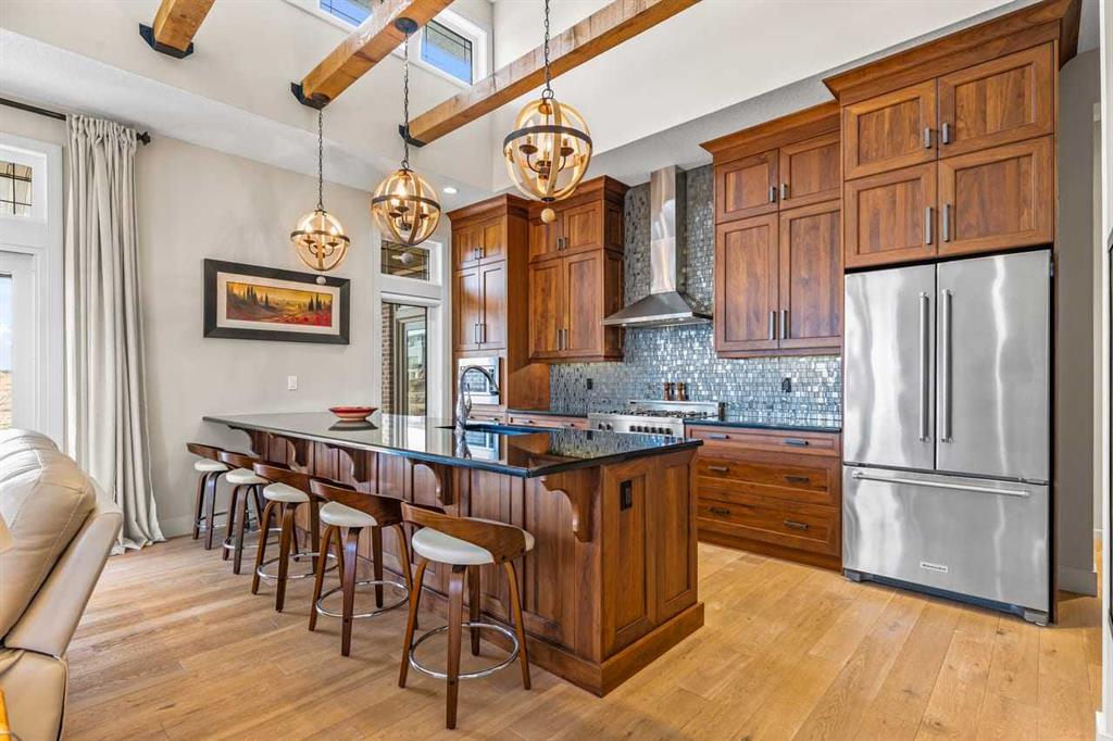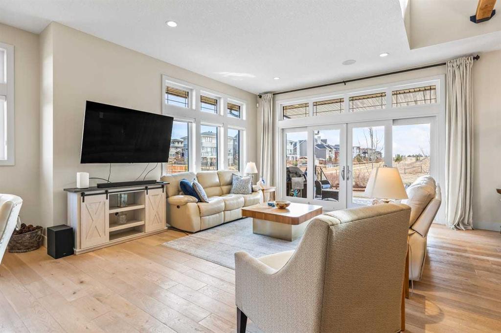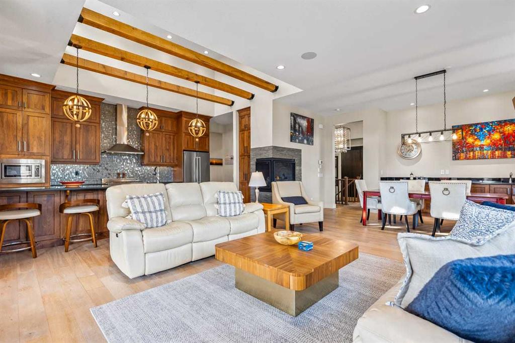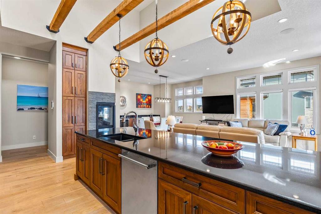 This stunning former showhome in the award-winning community of Harmony perfectly blends meticulous craftsmanship with an active and lakeside lifestyle. Spanning over 3,700’ of thoughtfully designed living space, the home impresses with vaulted ceilings, exposed beams, and premium upgrades throughout. The heart of the home is a chef-inspired kitchen featuring upgraded appliances, a butler’s pantry, and extensive cabinetry, flowing seamlessly into a bright dining area and a living room complete with a wet bar. The well-appointed main level is highlighted by a king-sized primary suite that fills with natural light. The spa-like ensuite offers a classic slipper tub, a large walk-in shower, and a walk-in closet. A bright home office, laundry room, and powder room complete this level. The high quality extends into the basement, which is designed for comfort and features two full-sized bedrooms, a large rec room, a wet bar, and a 4-pc bathroom with a double vanity and radiant heating throughout the lower level. Other features include triple-pane windows, herringbone-engineered hardwood detailing, central air conditioning, a Kinetico water softener/filter, a central vacuum, built-in speakers, high-quality window coverings, a storage shed, and $60,000 of additonal upgrades. Situated on a prime corner lot backing onto open field and pathways, the property offers unobstructed mountain views, a south-facing backyard, across from the park/greenspace, and one block away from Harmony South Beach. The outdoor space is fully realized with landscaping, irrigation, a custom deck cover, fencing, and Gemstone lighting. Even the heated triple garage is upgraded with durable polyaspartic flooring and a natural gas heater. Living in the award-winning community of Harmony, you’ll have access to two private lakes, beach access, community pathways, playgrounds, Mickelson National Golf Club, Adventure Park, and local amenities, plus the future Bingham Crossing.