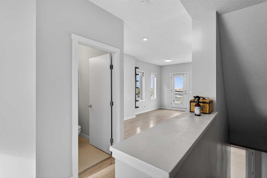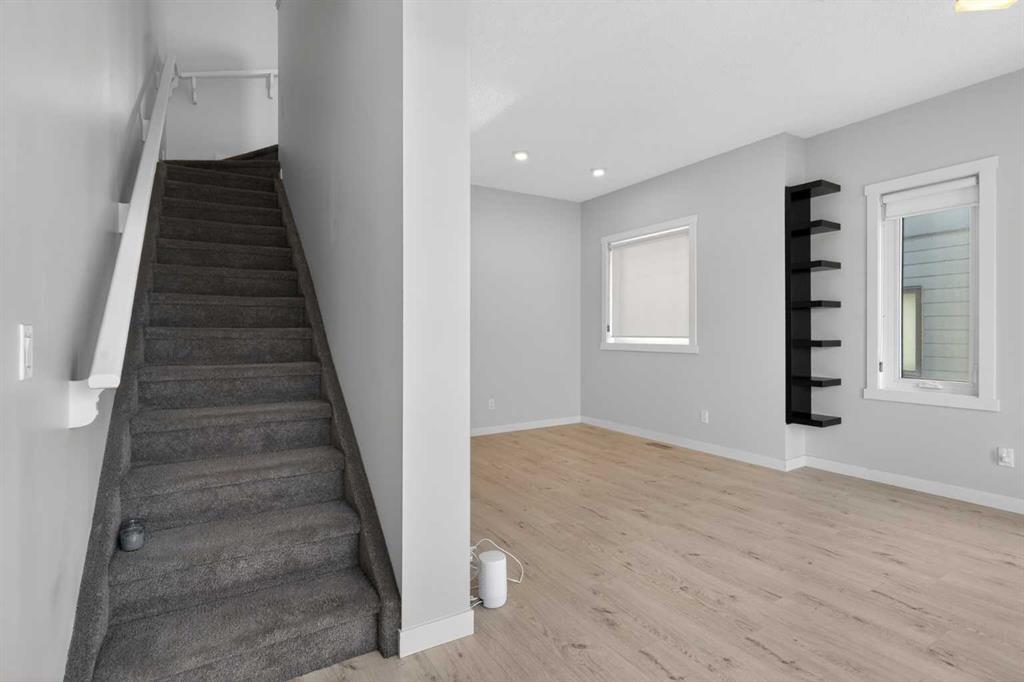 The open-concept main floor is filled with natural light and features a spacious living and dining area, ideal for both everyday living and entertaining. The contemporary kitchen is equipped with quartz countertops, a breakfast bar, and ample cabinetry, providing both style and practicality. A mix of carpet, laminate, and vinyl flooring adds comfort and durability throughout, while high ceilings enhance the bright, airy feel of the home.