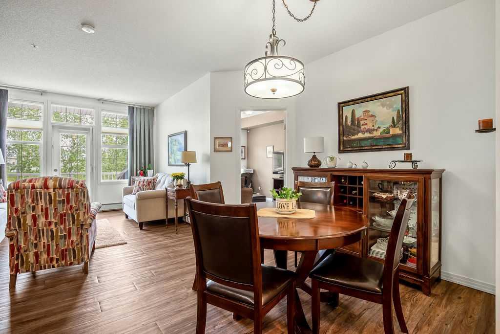 This is a lovely, immaculately maintained, 2 bedroom, 2 bath condo in the attractive Penncross condo building which is located next door to the Crystal Green Golf Course in the north side of Okotoks, convenient to all of Okotoks services, facilities & conveniences. The condo has lots of light filled rooms, a spacious feel with 9’ ceilings, easy care luxury vinyl plank in the main great room, all the stainless steel kitchen appliances have been upgraded in the last year inviting cooks to enjoy the modern kitchen, while providing plenty of storage for your cooking needs. The master bedroom has a large walk through closet area and a private 3 piece ensuite. The second bedroom is currently used as a cozy den/office area with walk through storage to the 4 piece bath and laundry area. The balcony is a welcoming outdoor space to spend leisure time with a gas BBQ hook up in place. There is one underground titled, heated parking space with storage in front and 1 assigned parking stall above ground. The building features amenities of a welcoming foyer with comfortable seating, themed areas off the elevators – a putting green, library, sitting and games area to enjoy, as well as a large fitness room that leads to the fully landscaped, south facing courtyard. Living here also facilitates access to Crystal Shores Lake with beach house & lake access for additional activities (Lake HOA fees are included in the monthly condo fee). When you enter the front door you will appreciate the secure, quiet ambiance. This may be the one for you!