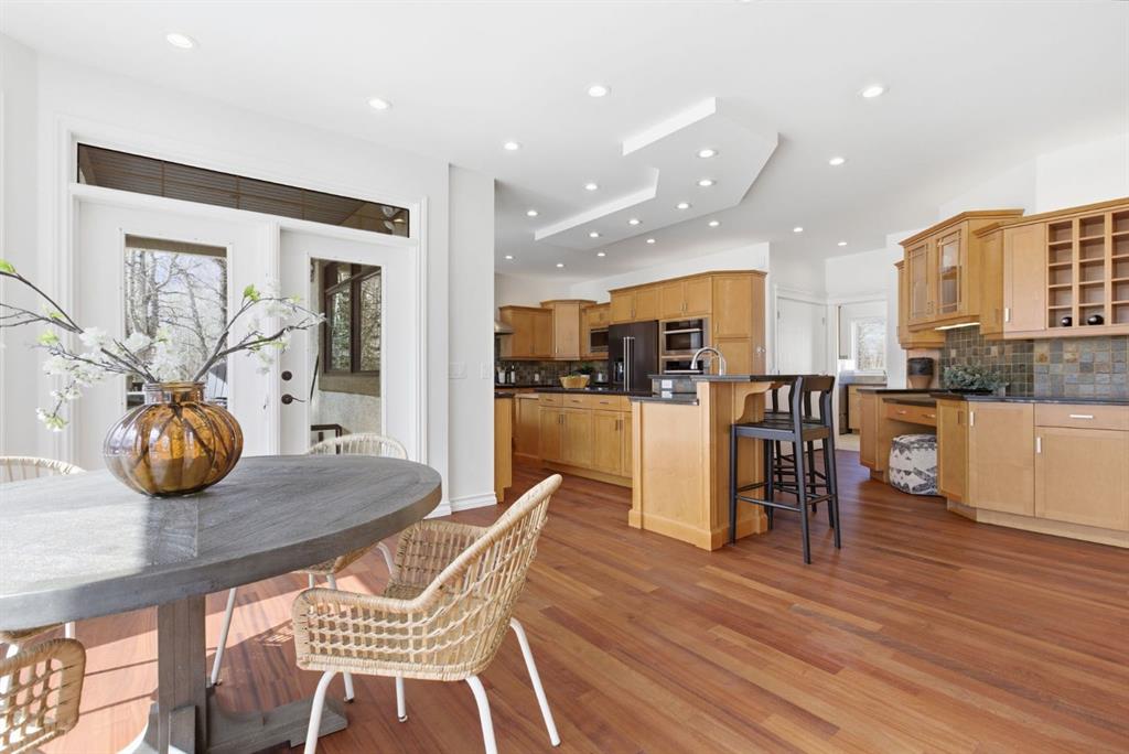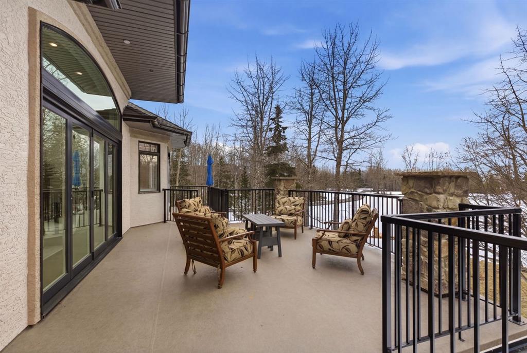 Inside, the home is bright in a way that changes the whole experience of acreage living. Windows in nearly every direction keep the outdoors present, refinished African walnut hardwood brings warmth underfoot, and the more traditional layout gives the home a sense of comfort and structure that is becoming harder to find. The rebuilt southwest-facing deck is a major part of this acreage’s way of living. Engineered with substantial beams and finished with heavy-weight UV-stabilized vinyl decking, it is a high-end outdoor space built to be used and enjoyed. Accordion doors off the living room open fully to the deck, allowing the whole main floor to breathe.
