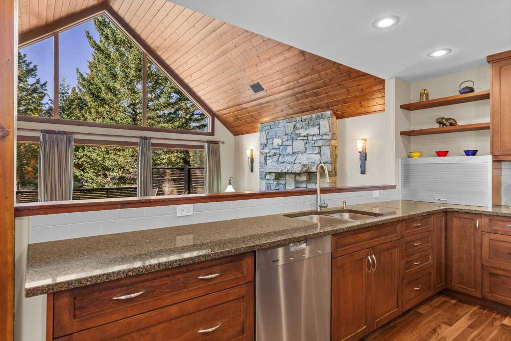 This 5-bedroom, 4046 sq ft home in the peaceful enclave of Blue Grouse Ridge offers space, comfort and mountain charm. The generous foyer opens into a spacious Great Room, featuring rich walnut flooring. In addition, select sections—such as the foyer, powder room, main-level hallway and mudroom, feature elegant travertine flooring, offering timeless natural stone appeal and durability. The living room boasts a striking Rundle stone gas fireplace and vaulted ceilings. The custom kitchen is thoughtfully designed with a premium Wolf Gourmet Range and a large island—perfect for culinary enthusiasts. Also on the main level is a spacious dining room that opens onto a large, sun-filled view deck—complete with a luxurious hot tub, rear yard, and an impressive outdoor stone wood-burning fireplace, ideal for entertaining or relaxing under the stars. The family room, with vaulted ceilings and a cozy Riverstone wood-burning fireplace, is framed by French doors that offer privacy. Up the Walnut staircase with elegant wrought-iron railings, you\'ll find a serene master retreat with vaulted ceilings and a spa-like ensuite, featuring a steam shower and soaker tub. Two additional bedrooms and a four-piece bath complete the upper level. The lower level includes a home theatre room, a gym or games area, two additional bedrooms and a 4-piece bathroom, a wine cellar, an enormous storage room—and in-slab heating throughout for year-round comfort.