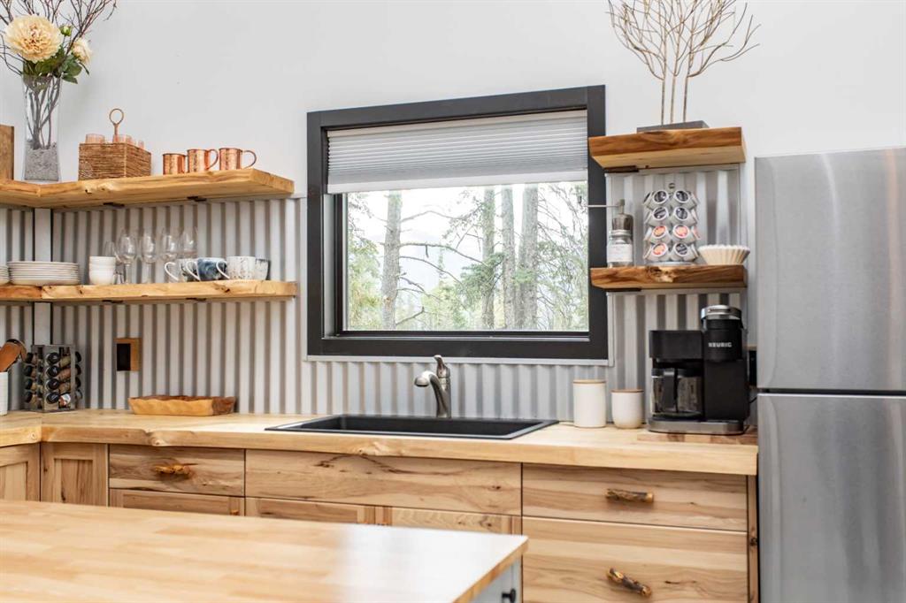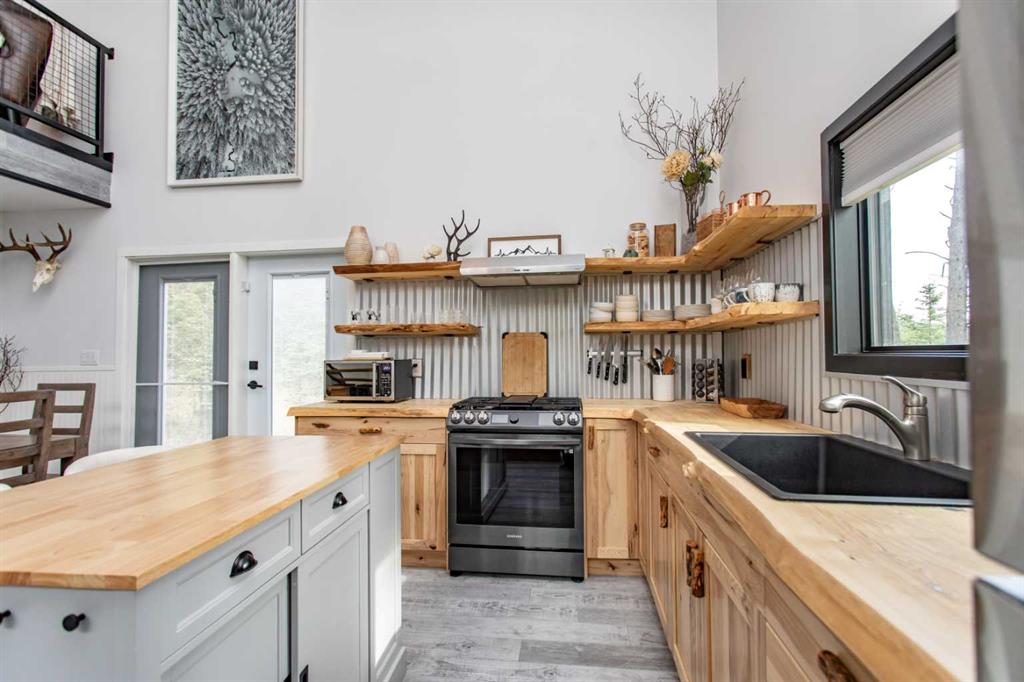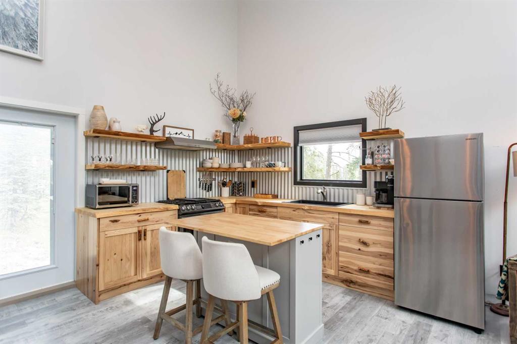 Built in 2019, this 1.5 storey cabin features an open concept layout with soaring ceilings, large windows, and a warm modern rustic design. The custom poplar kitchen with live-edge countertops, open shelving, new stainless steel appliances with propane range and centre island which creates a space that is both functional and visually stunning. The main living area includes a cozy propane fireplace, perfect for relaxing after a day outdoors. The home offers 2 good sized bedrooms, 1 full bathroom with custom cedar shower, main floor laundry, and a loft space for additional sleeping or living area.