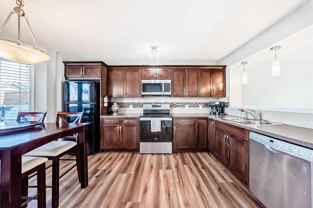 Located on a quiet street in the SE corner of McKenzie Towne, this home is a short walk from shopping, parks and the McKenzie Towne bus terminal. Main floor offers a bright, open layout with new LVP flooring throughout. The living room has large windows bringing in plenty of natural light, a gas fireplace with mantle and TV ledge. The kitchen includes full-height cabinetry, ample counter space, tile backsplash, and a raised eating bar overlooking the living room. Stainless steel dishwasher, OTR microwave and stove are newer. Adjacent dining nook is positioned in a bay window setting with backyard views.