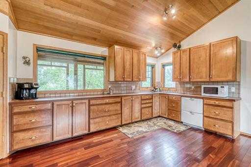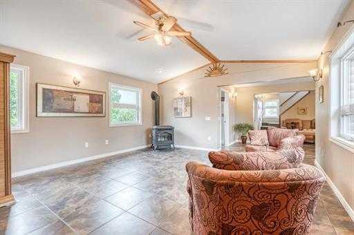 Calgary (under an hour), Airdrie (45 min), or Drumheller (20 min). The home rests beautifully amongst a variety of mature trees and rolling landscape… walk the property and pick saskatoon berries off the bursting bushes, and in the winter, enjoy the amazing toboggan hill and flat meadow as a great place to build a hockey rink. With 2,543sq’ above grade, there is plenty of room in this home where pride of ownership boasts stunning condition. Develop the 817sq’ unfinished basement for a total of 3,360sq’. 3 bedrooms, 3.5 bathrooms, this home would be fantastic as a multi generational home, Bed & Breakfast, or AirBnb. Enter the home to find a spacious foyer leading to the converted log cabin turned bedroom! Complete with vaulted paneled ceiling, lofted storage and half bath. An additional 4-piece bathroom can be accessed from the hallway. The mudroom features of storage and front load washer and dryer. Acting as a secondary entrance to the home, the mudroom can be entered through the expansive east facing enclosed porch. The heart of the home is the massive kitchen with hardwood floors and vaulted ¼ sawn white oak paneled ceiling detail. The spacious family room and living room features a Mt Vernon Quadrafire 50lb hopper pellet stove and access to a west facing deck. Another bedroom and 3-piece bathroom complete the main level. Upstairs in the master retreat! Vaulted ceilings, spacious walk-in closet, 4-piece ensuite with soaker