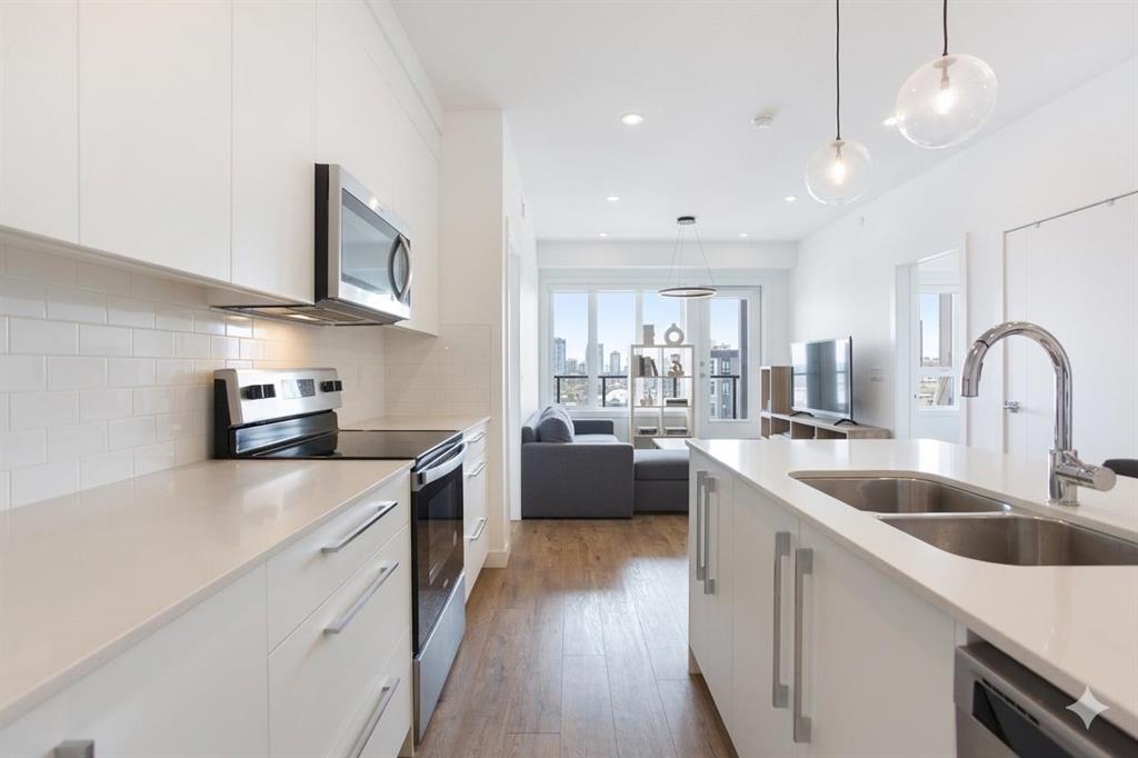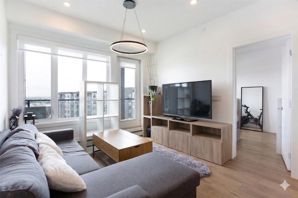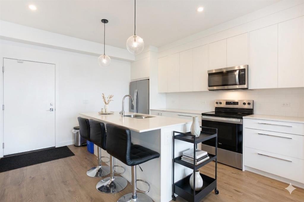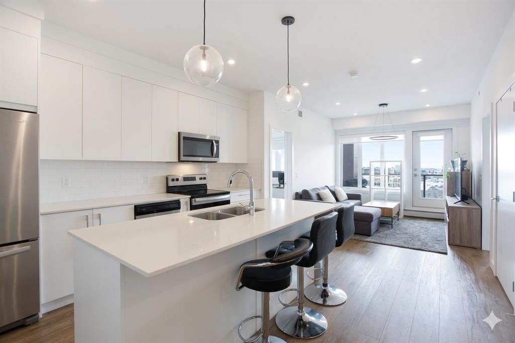 This 835 sq. ft. top-floor condo at Skyview North offers a sophisticated, modern lifestyle in one of Calgary’s most vibrant communities. From the moment you step inside, the bright, open-concept design impresses with its wide vinyl plank flooring and a crisp, neutral color palette that complements any style. At the heart of the home is a stunning kitchen, where a large central island with a double undermount sink, serves as the perfect hub for morning coffee or casual dinners, offering seating for four alongside ample cabinet and counter space. The kitchen flows seamlessly into a bright and inviting living room, creating an ideal layout for both quiet nights in and lively entertaining. From here, you can step out onto the massive, covered balcony—perhaps the home’s most striking feature. Spanning the entire width of the unit, this expansive outdoor terrace provides incredible additional living space for lounging or dining while enjoying the fresh air. The thoughtful split-bedroom configuration ensures maximum privacy for residents and guests alike. The primary suite is a true retreat, boasting a spacious walk-through wardrobe that leads into a private four-piece ensuite, complete with dual vanities and a large walk-in shower. On the opposite side of the condo, the second bedroom is equally well-appointed, offering convenient access to the main full bathroom through its own walk-through closet. In-suite storage and laundry rooms, plus a secure, titled underground parking stall add to the effortless convenience of this home. The building itself is packed with amenities, including a welcoming entrance lobby, a dedicated bike room, and direct access to a 115-acre environmental reserve for nature lovers. With ground-level retail at your doorstep, a future LRT station planned directly across the street, and the shopping and dining of Sky Pointe Landing just moments away, this top-floor gem offers an elevated lifestyle you won’t want to miss. Book your showing today!
